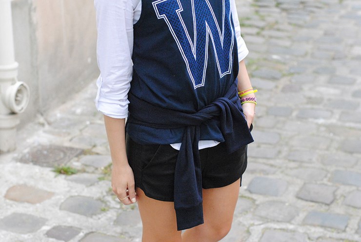 J’ai craqué sur ce top style « maillot sportif » le mois dernier. Je l’ai acheté malgré un détail rédhibitoire pour moi : la coupe débardeur large. Une forme qui ne me convient pas du tout ! J’ai alors pensé à comment le porter et j’ai opté pour une superposition avec une chemise blanche retroussée. Vous en dites quoi ?