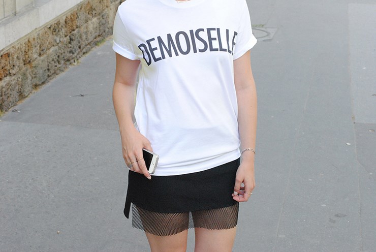 Tee-shirt Ma Demoiselle Pierre (en vente ICI), jupe DIY (tuto à venir cette semaine…), lunettes Sonia Rykiel, chaussures Choice et chouchou Urban Outfitters.