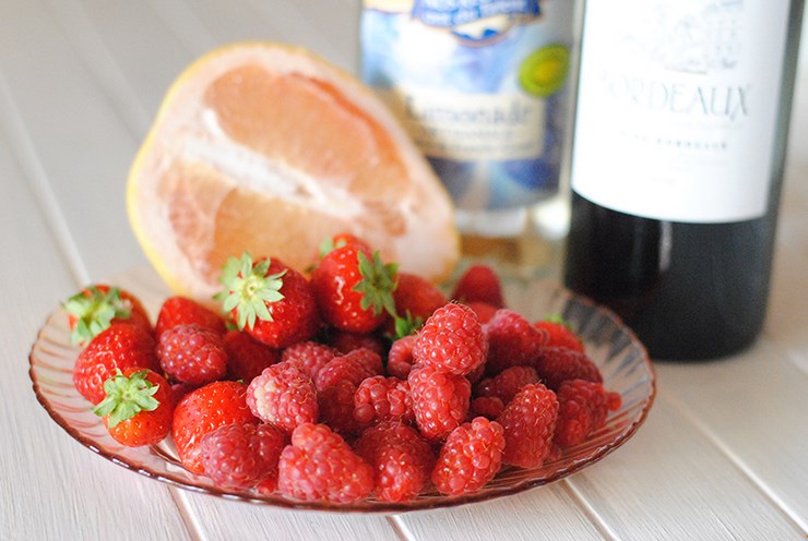 Éplucher le pamplemousse puis découper des petits morceaux. Ajouter les bouts de pamplemousse au mélange vin/lemonade ainsi que les framboises et les fraises coupées en deux (sans les feuilles).