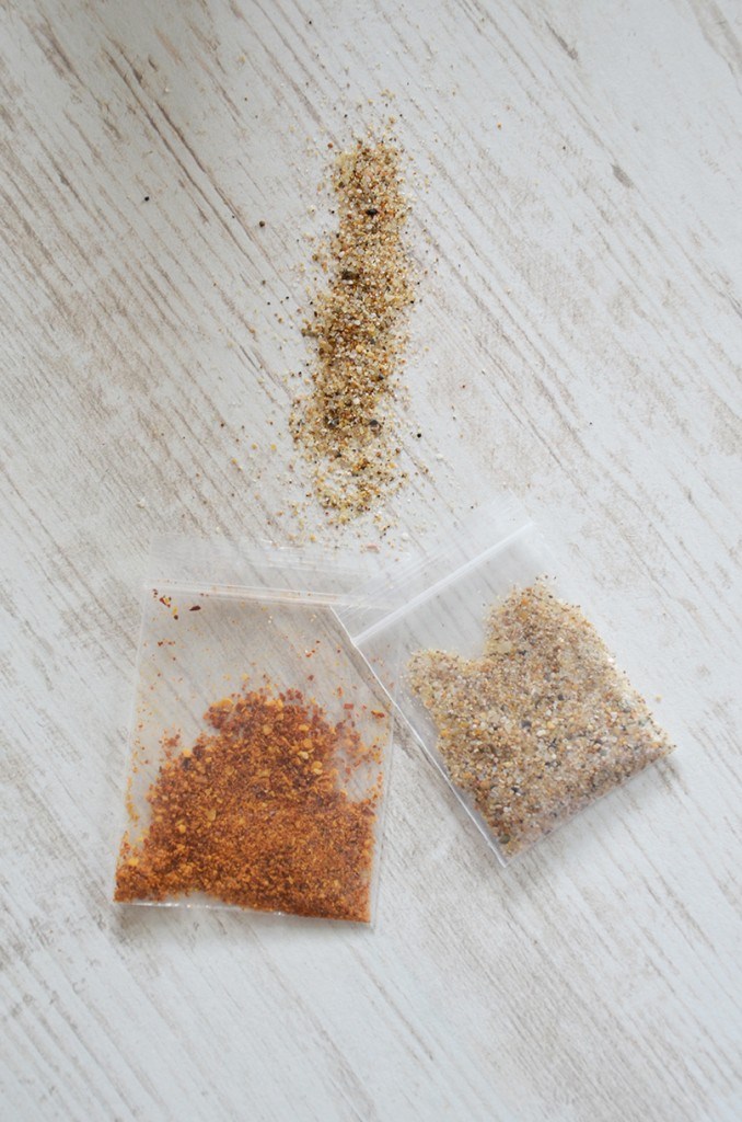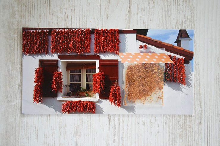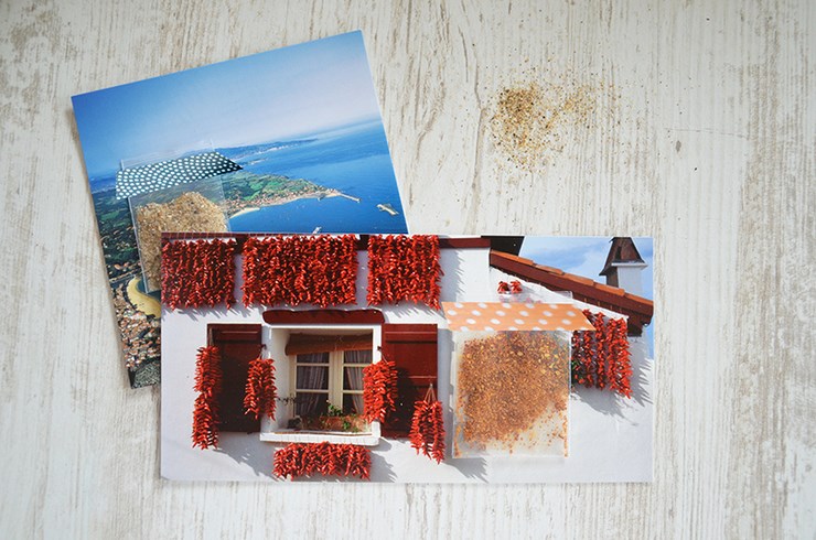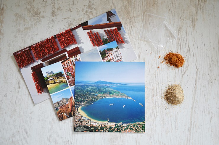 J’ai choisi des photos avec des piments mais aussi des plages. Les petits sachets plastiques sont alors remplis de sable et de piments d’Espelette en poudre (juste un soupçon pour éviter les problèmes avec La Poste). Vous pouvez ainsi partager les saveurs de vos voyages avec vos amis ou votre famille !