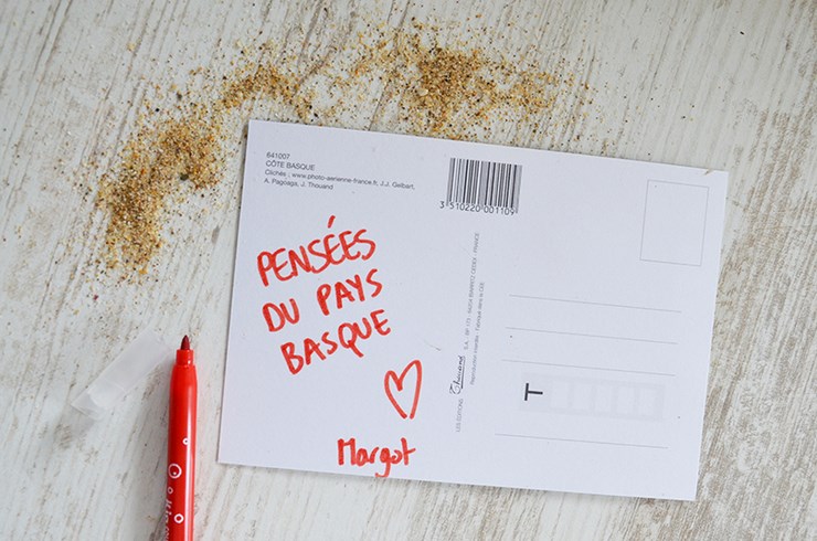 J’adore envoyer des cartes postales. Et j’ai su que c’était une habitude qui ne s’était pas perdue en voyage. Si vous aussi vous aimez écrire des cartes à vos proches voici un DIY très simple pour envoyer un peu de vacances en poudre à vos proches…
