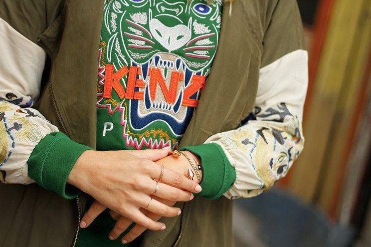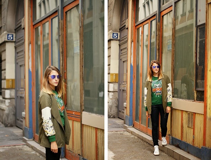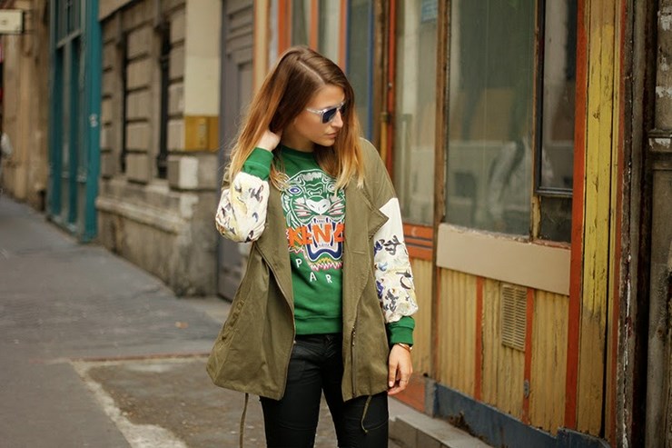 Sweat Kenzo, parka et bracelet jonc Choies, slim enduit Freeman T.Porter et sneakers Ebay.