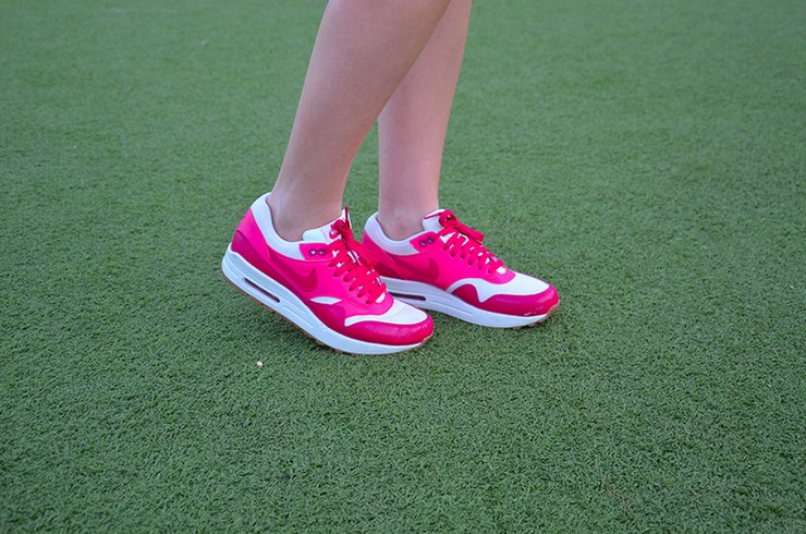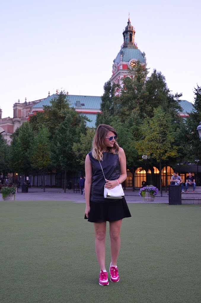1er jour, 1er look : lunettes Oakley, top en cuir G-Star, jupe et sac Zara et Nike Air Max.
