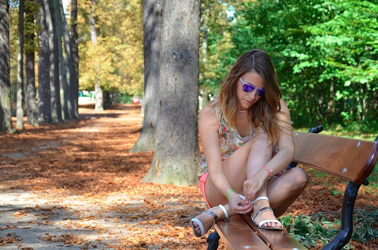 Robe Topshop portée en top, short H&M Trend, lunettes Oakley et sandales Zara.