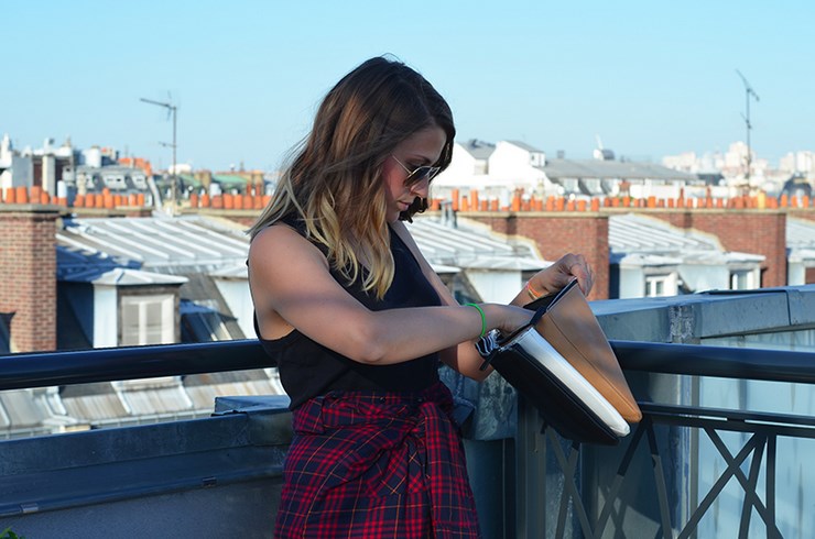 Débardeur et chemise Jennyfer, sac porté en pochette Zara, sandales Guess et lunettes Ray Ban.