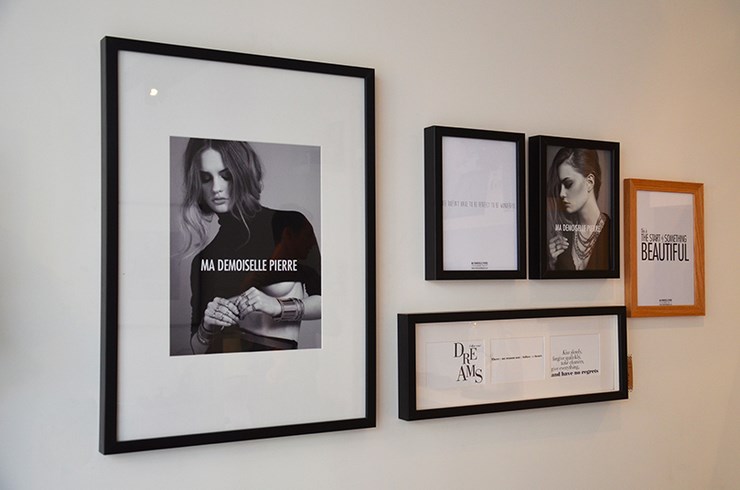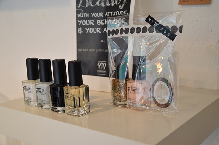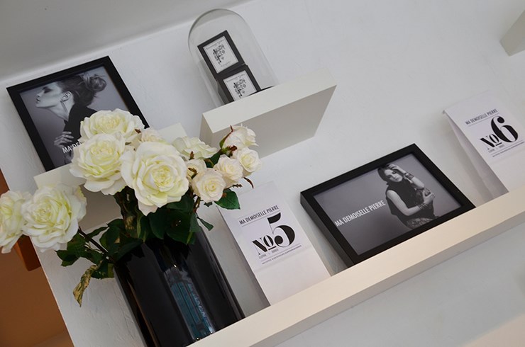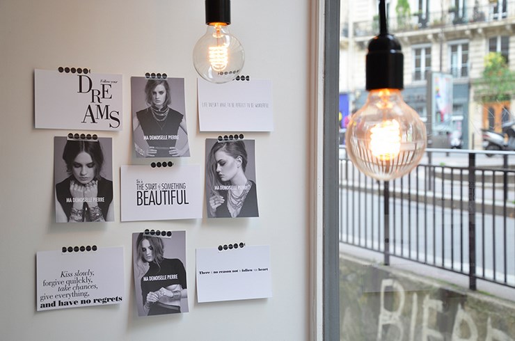 J’avais envie de partager des photos de la boutique si vous ne la connaissez pas encore mais aussi des nouvelles créations de Mademoiselle Pierre (bijoux, tee-shirts…). Je fonds pour toutes les bagues… Une nouveauté bien sympa : le kit nail art (2 vernis Color Club + un rouleau de stripping tape) ! Pour une superbe idée nail art, voici le lien vers la vidéo d’Aurore. D’ailleurs Aurore est la manucure attitrée ici, elle est présente tous les samedis (15€ le nail art).