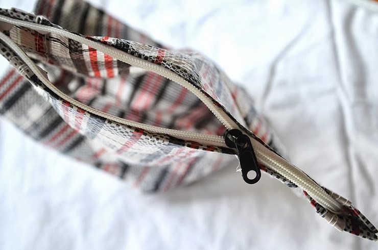 Faîtes de nouveau des ourlets de 1cm avec votre ongle et collez les côtés de la fermeture au niveau des pliures. Les surplus de la fermeture doivent être à à l’intérieur de la pochette.