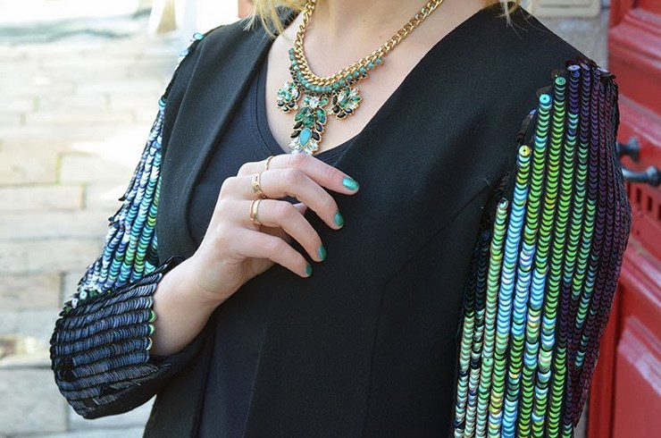 Super cette veste!!!!! Ca me fait penser à des écailles de poisson hé hé! Ton look est super!!!!!! Le vert du collier, des ongles et des paillettes est juste parfait!