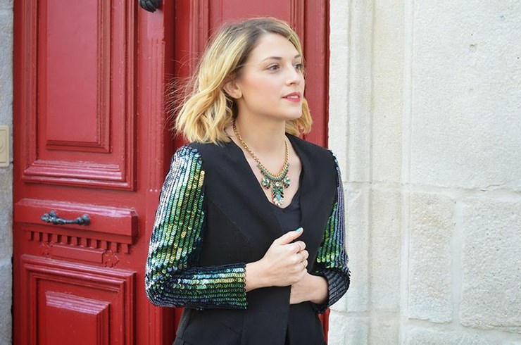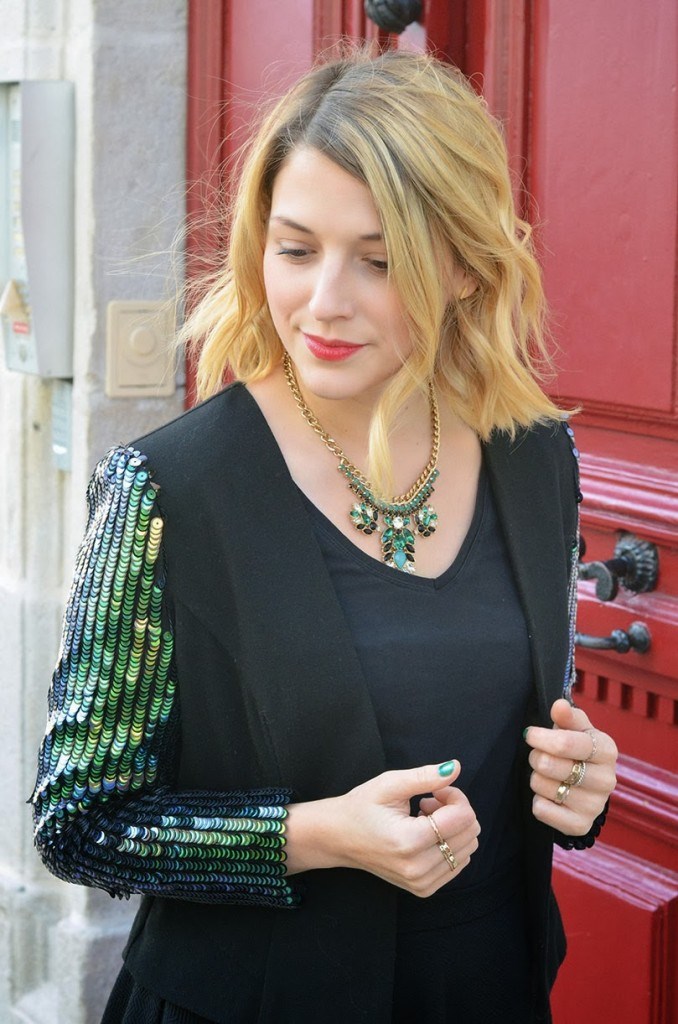 J’ai cette veste dans mon dressing depuis des mois ! Autant vous dire que je n’ai jamais réussi à la porter. Mais je la gardais précieusement dans l’espoir de trouver l’occasion parfaite. Elle s’est présentée hier, jour de Noël où le vert sapin est permis ainsi que l’overdose de paillettes ! et je n’ai pas lésiné… vernis, collier et cette veste que j’adore. J’espère que vous avez passé une belle journée de Noël.
