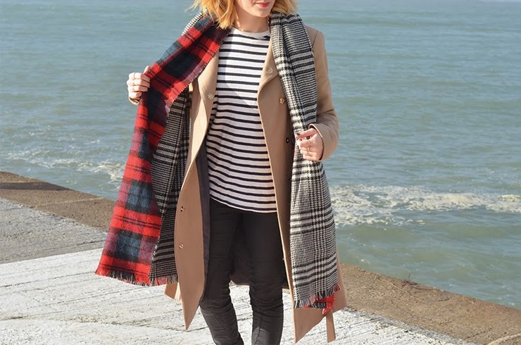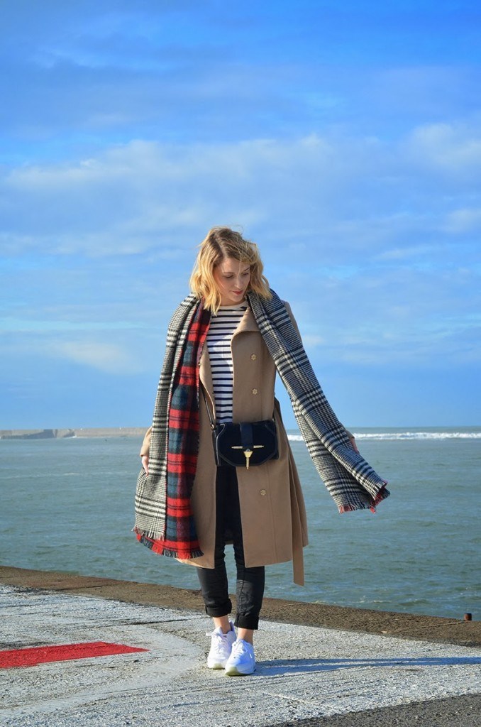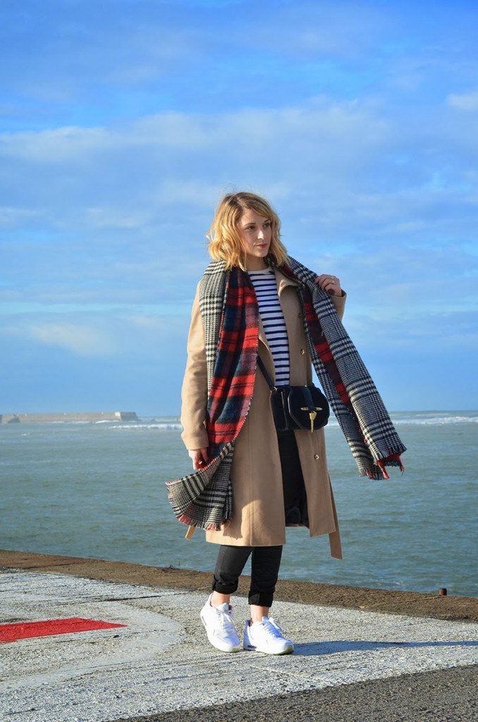 Manteau C&A, marinière vintage, pantalon Freeman T Porter, sac et écharpe Zara et Air Max Nike