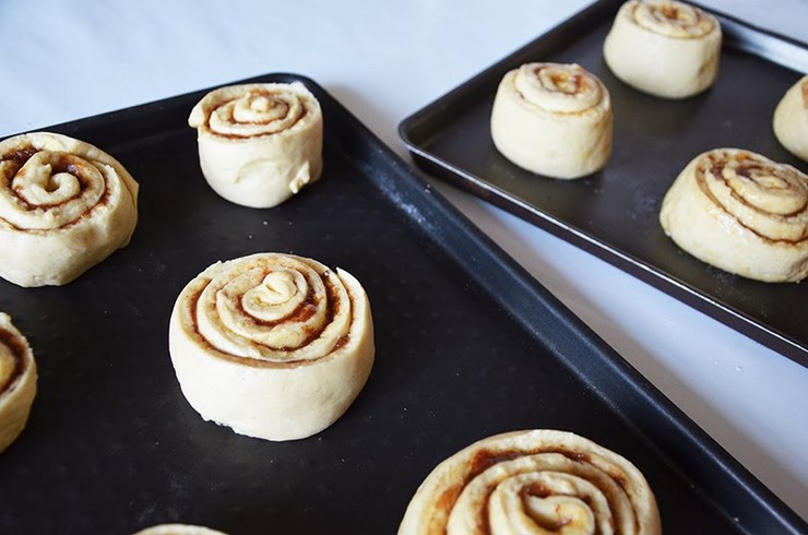 Étalez la garniture obtenue sur toute la pâte, découpez des lamelles égales que vous roulerez sans trop serrer pour créer des escargots. Déposez-les à plats sur une plaque et laissez-les lever 1h. Pour finir, dorez avec un jaune l’oeuf et un pinceau et saupoudrez légèrement de cassonade. Environ 10 min de cuisson au four à 200°C, ils sont prêts dès qu’ils sont dorés.