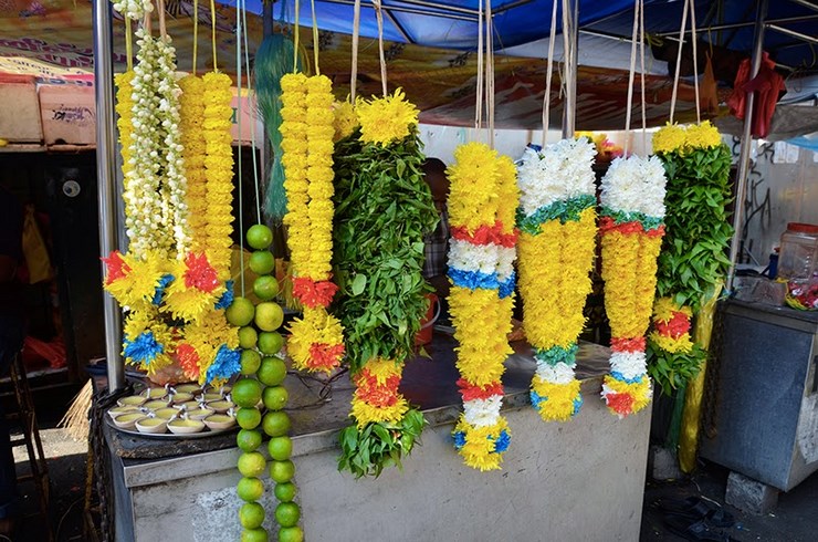 Colliers de fleurs fraîches à l’entrée des temples Indiens.
