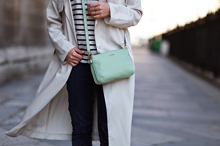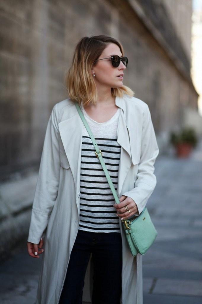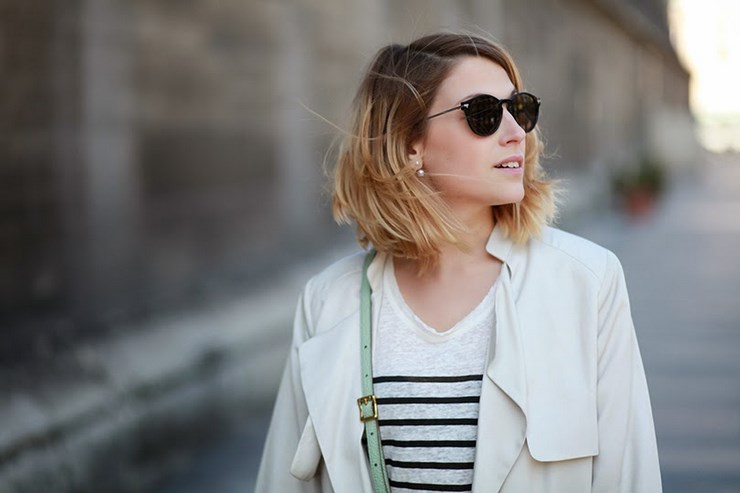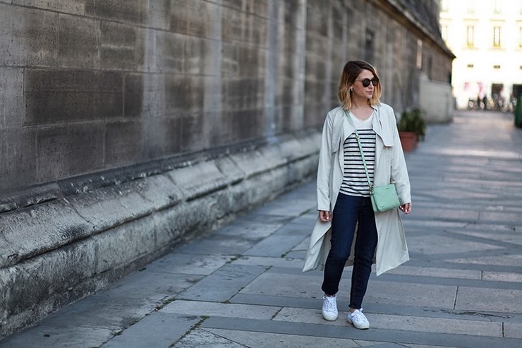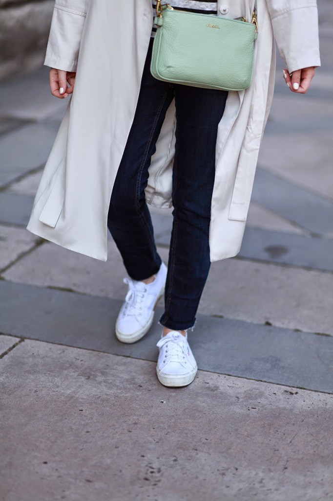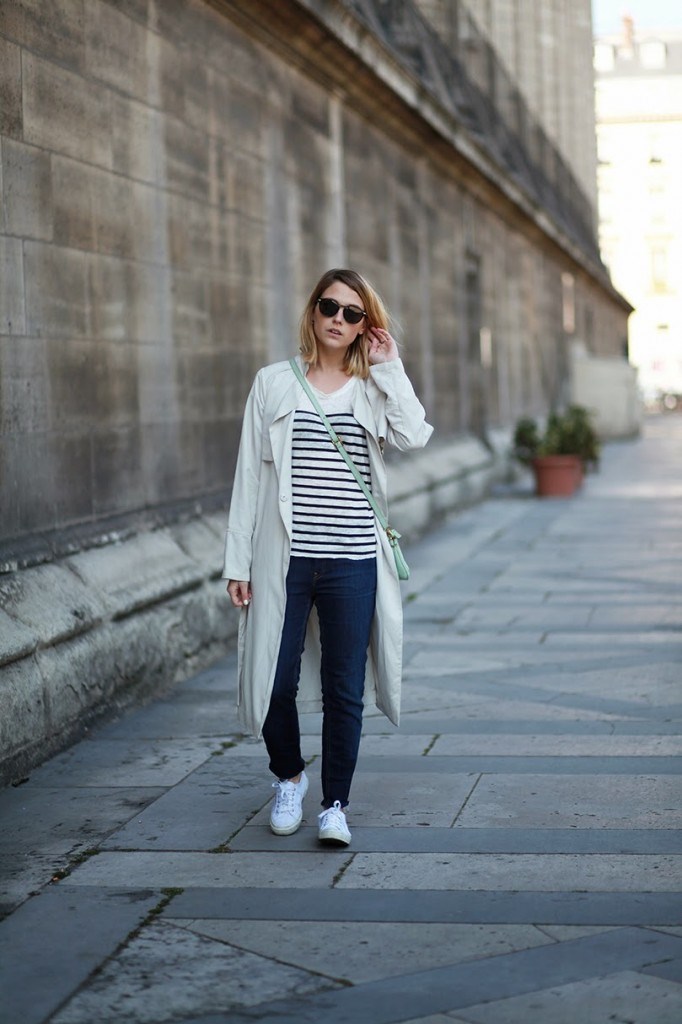 Trench H&M, marinière Swildens x Sarah Lavoine, jean Lee (coupes DIY), baskets Superga, sac Fossil et lunettes G-Star.