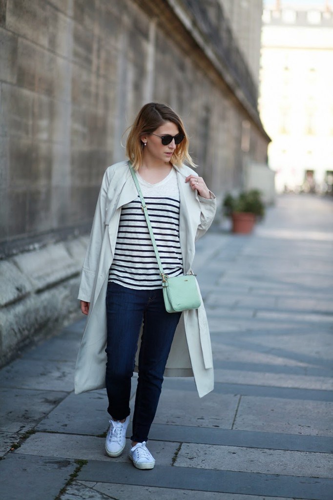 12 mai 2014 at 7 h 55 minCette tenue est simple mais tellement soignée, j'adore le coté un peu chic du trench avec les basket et la marinière qui donne un coté plus décontracté !