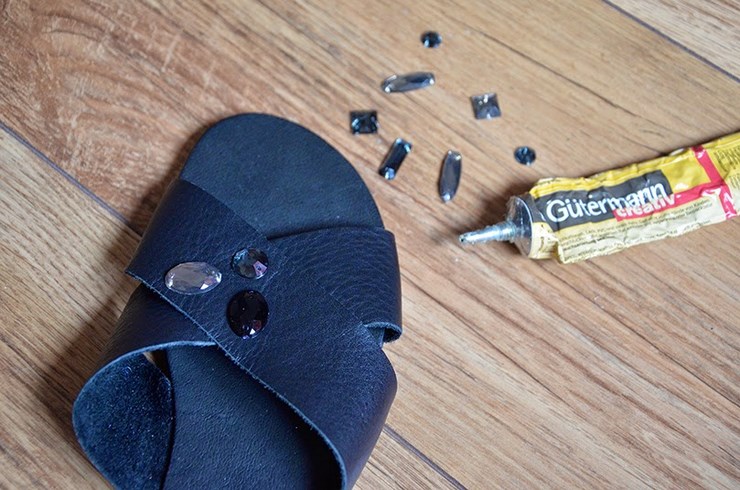 Imaginez votre dessin à plat, puis décorez la chaussure. Utilisez de la colle pour strass ou cuir. Déposez une pointe de colle derrière le strass, déposez le brillant et appuyez très fort 1 minute.
