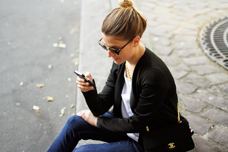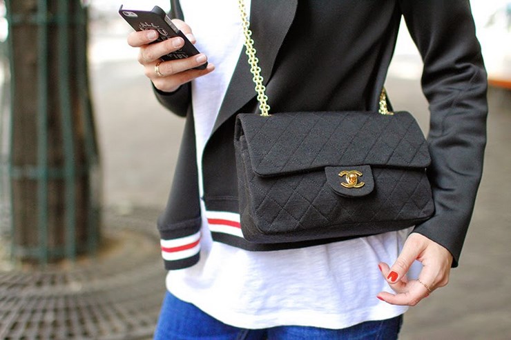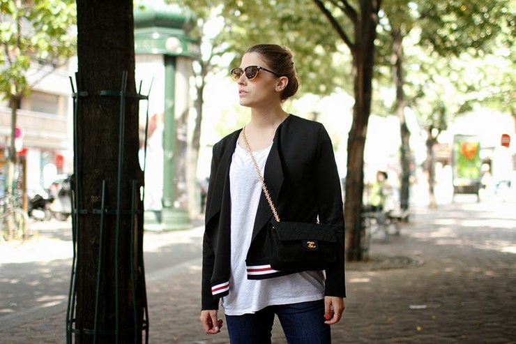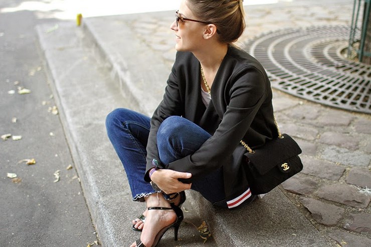 Veste Zara, top Sud Express, jean Lee, talons La Halle, lunettes de soleil Unfollow, coque iPhone Mr Wonderful et sac Chanel via InstaLuxe.