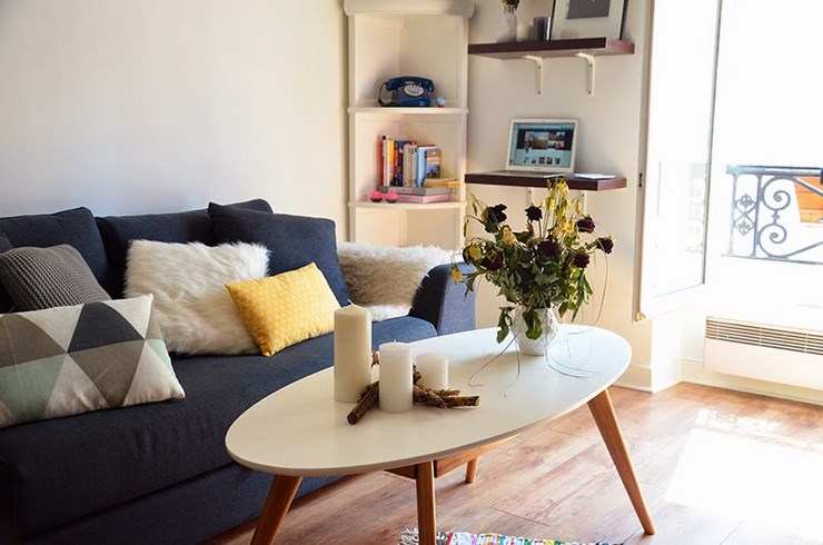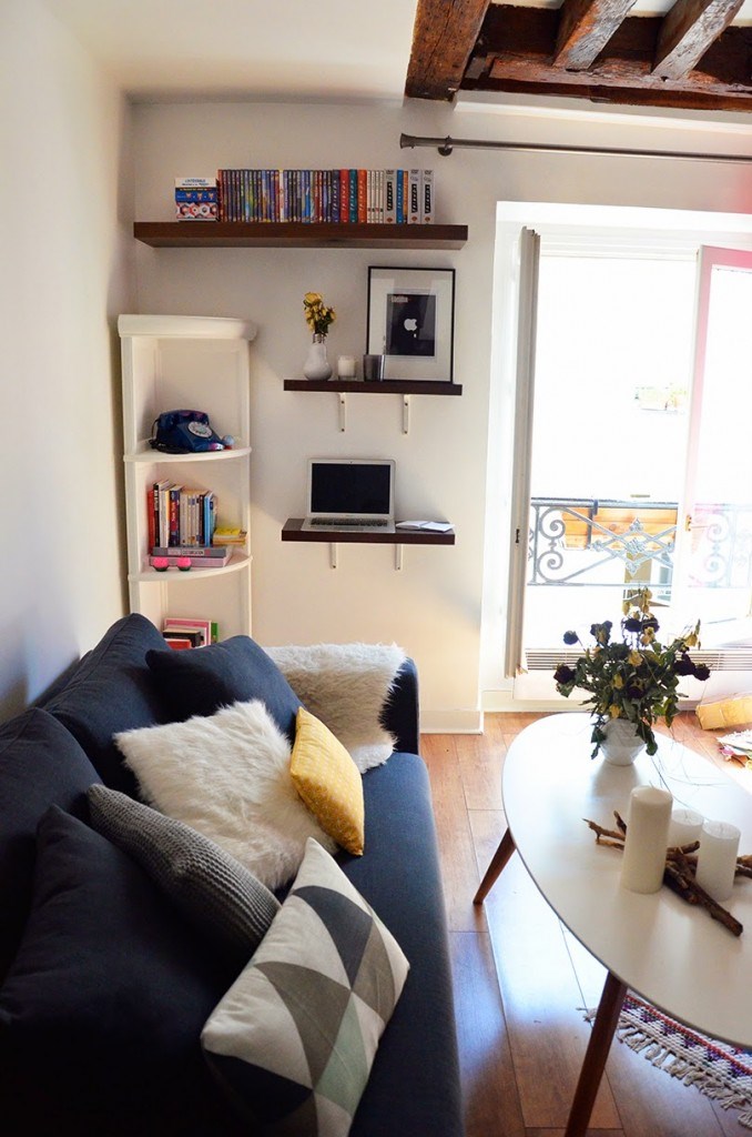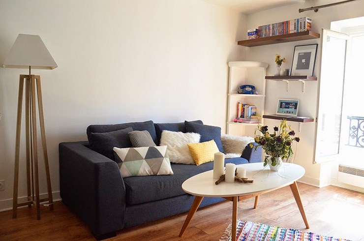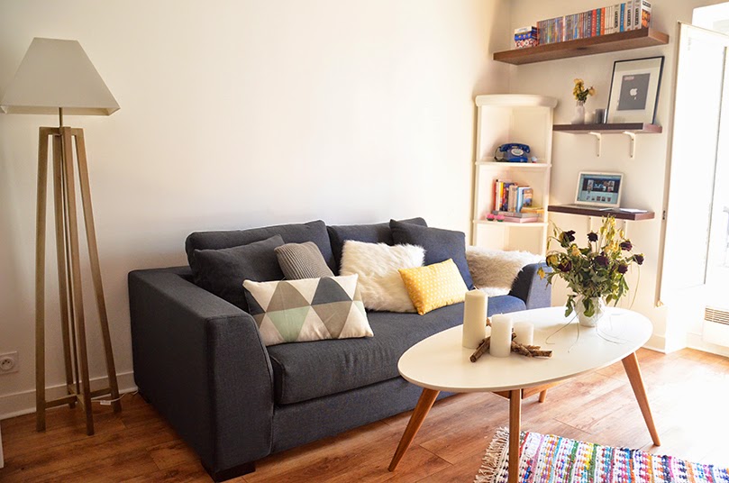 Très joli. Le canapé a l'air bien confortable. Où as-tu trouvé l'étagère d'angle blanche ?