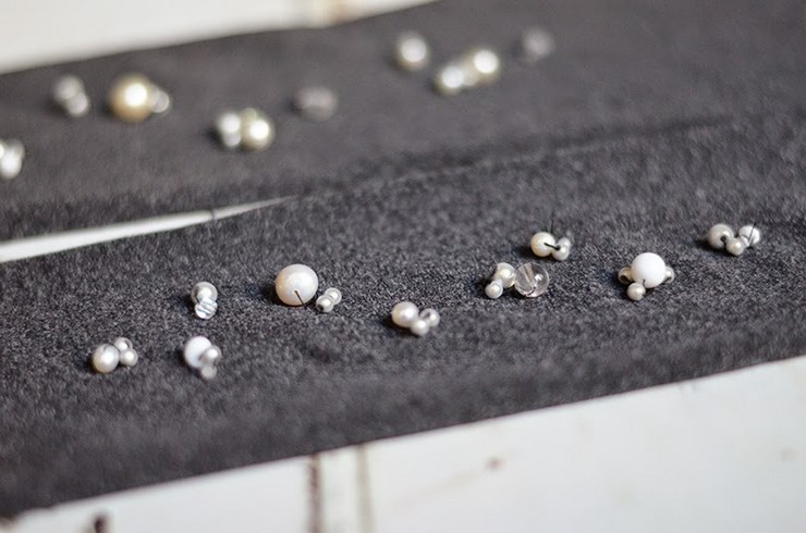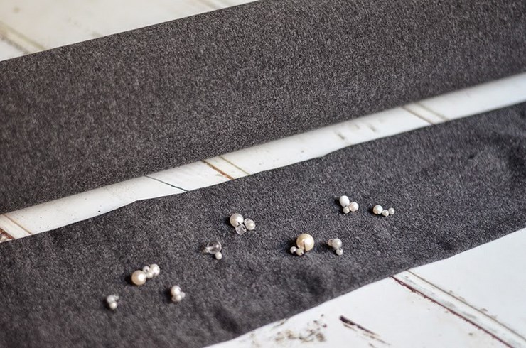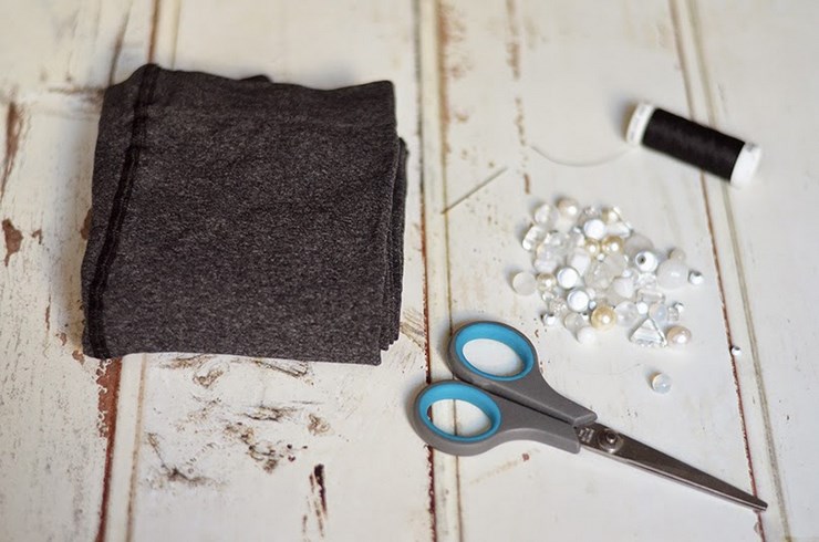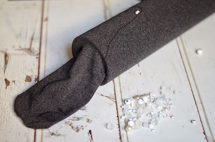 Commencer par nouer l’extrémité de votre fil et débuter à l’intérieur du collant pour cacher le nœud. Coudre les perles tout au long de votre jambe et répéter l’opération sur la seconde.