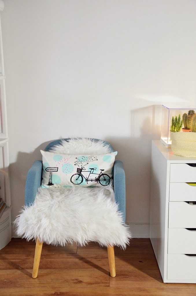 Fauteuil BUT, coussin La cerise sur le gâteau, peaux BUT, meuble trieur IKEA, lampe cactus (à découvrir dans une prochaine vidéo déco), boites en bois IKEA, tablette et message Mr Wonderful, bocal IKEA, desk planner HEMA, lampe IKEA, chaise BUT, cadre IKEA, illustration trouvée sur Sergeant Paper, bougies HEMA et bureau BUT