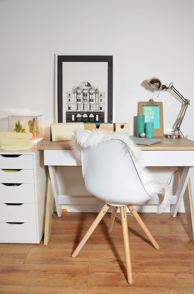 Jaime beaucoup le bureau en bois/blanc. Un coin cosy parfait pour travailler.