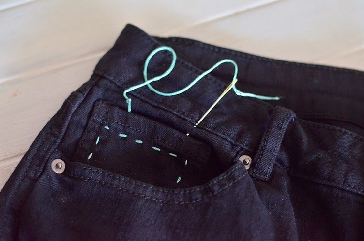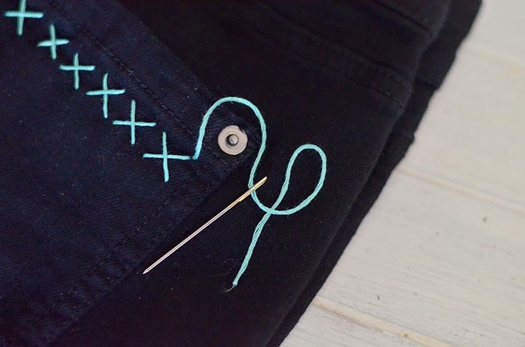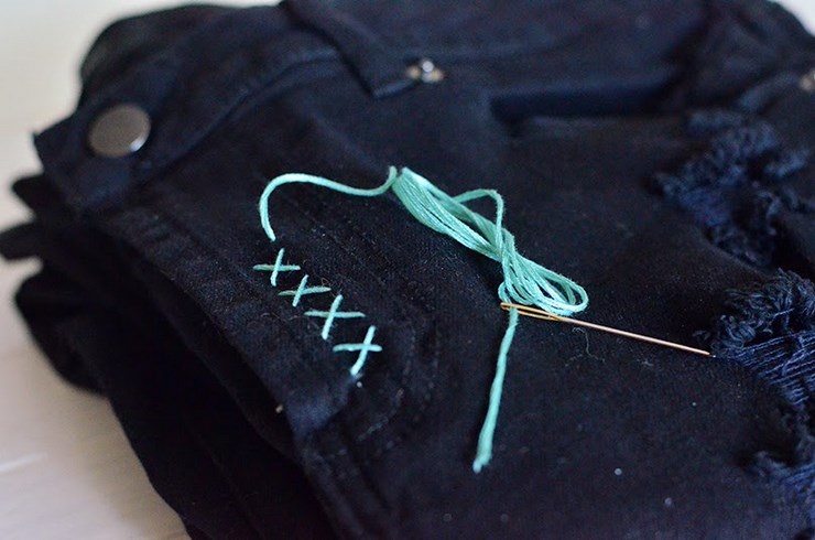 Commencez par un nœud à l’extrémité du fil de coton et débutez par l’intérieur du pantalon pour cacher le petit nœud. Ici j’ai dessiné des croix pour habiller le devant du jean. Rien de compliqué, juste des points simples.