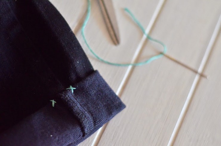J’ai rouloté mon jean et j’ai cousu des petites croix de chaque côté des ourlets pour faire tenir le tissus. 2 minutes top chrono 😉