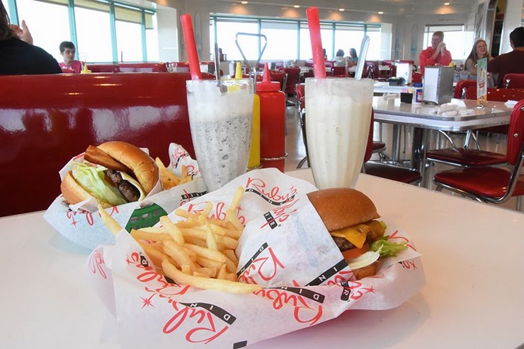 En 2h de route nous étions à Huntington Beach, notre premier stop. Marion du blog Fringe and Frange m’avait conseillé Ruby’s diner (au bout du Huntington Beach Pier). Un diner avec vue sur la mer, serveur aux uniformes assortis, burgers et surtout Milk Shakes. Le décor vaut vraiment le détour, le burger était très bon et que dire du milk shake…