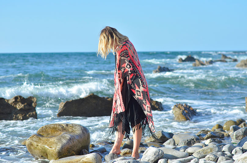 Ces photos ont été prises par Nico. Vous l’avez peut-être déjà vu sur Snapchat (pseudo youmakefashion) mais nous étions à Hendaye, sur une crique au niveau de la corniche. Il a fallu descendre la falaise avec une corde pour accéder à ce superbe décor. Une de mes plages préférées, si calme. Il faisait très beau #nofilter, je porte une tenue très simple : une robe à franges et un kimono coloré. J’adore ce kimono, je ne sais pas si ça se verra en photos mais il n’a pas vraiment de manches. Il tombe simplement de chaque côté de mes épaules. Très léger, idéal pour cette saison.