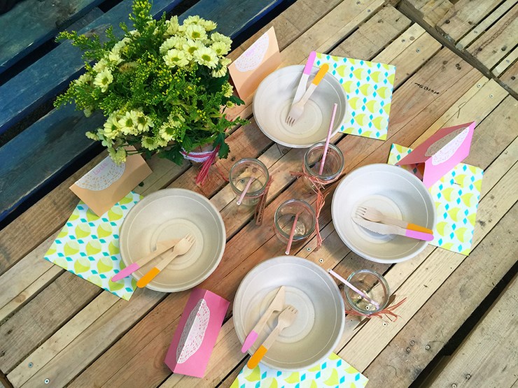 Couverts en bois Monoprix, fournitures BHV (trouvables dans votre boutique de loisirs créatifs), serviettes, assiettes HEMA, pompons et pailles TATI.