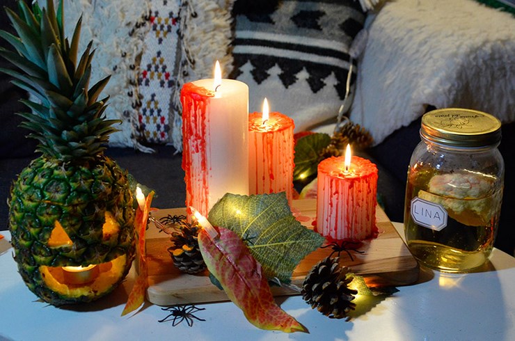 La semaine dernière je vous proposais des idées pour décorer vos citrouilles (retrouvez l’article ici). Et aujourd’hui voici 3 DIY déco pour Halloween. Une fête que j’adore même si elle est peu répandue en France, malheureusement. Un ananas creusé, des bougies ensanglantées et un cerveau dans du formol.