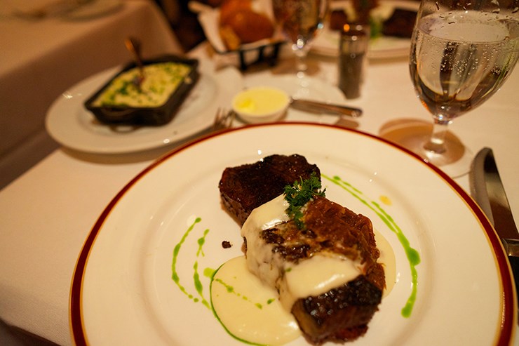 Je cherchais un beau restaurant pour l’anniversaire de Nico. Cette adresse est alors pour une occasion spéciale. Une grande salle qui rappelle les décors de la Princesse de la grenouille^^Et à la carte vous trouverez principalement des viandes. Comptez environ 48$ pour le plat, 11$ pour l’accompagnement. Nous avons tous les deux commandé le plat du jour : Philadelphia style strip steak, Cheese Sauce and caramelized onions. Super adresse pour les carnivores et très bon dessert (profiteroles banane).new york blog voyage bonnes adresses restaurant bar américain