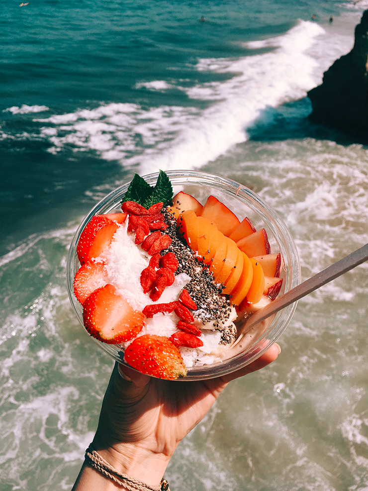J’ai pris le « power house » : bananes, dattes, beurre de cacahuètes et lait de soja. Les copines ont choisi « endless summer » : pêche, abricot, banane et framboises ». Nous avons dégusté ça au bord de la mer qui se trouve à 1 minute à pieds et nous avons adoré. Un petit dej (ou un goûter) très copieux. Je n’ai même pas déjeuner ce jour-là. Le meilleur açaï bowl que j’ai pu goûter!!!