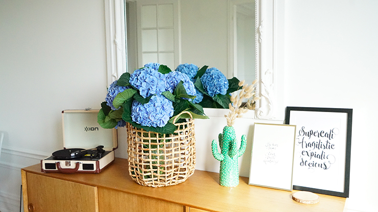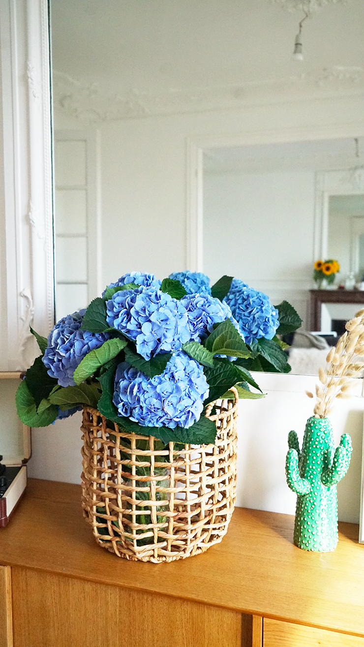 Ce qui est drôle c’est que fin Septembre est précisément la saison de ces deux fleurs. J’ai donc décidé le jour de l’aménagement de fleurir l’appartement avec des tournesols et des hortensias. Bleues bien-sûr mais c’est une autre histoire.