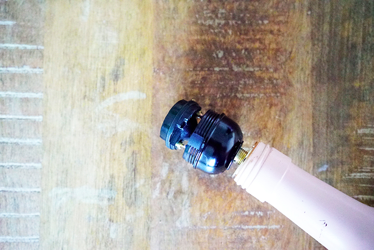 Passez ensuite le câble dans le trou afin qu’il ressorte par le goulot. Passez le câble dans l’ouverture du talon puis raccordez les fils à la douille à l’aide d’un tournevis. Enfoncez le talon dans le goulot puis vissez la douille sur le dessus.