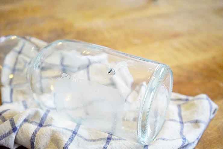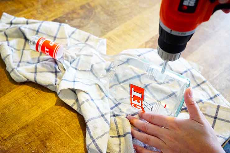 Percez un trou sur le côté de la bouteille vers le bas. Maintenez bien la bouteille avec un torchon pour ne pas qu’elle glisse ou vous blesser. Allez-y le plus doucement possible avec la perceuse, le trou se formera petit à petit (il vous faudra un peu de patience). Si vous sentez que le verre chauffe, mettez un peu d’eau tiède sur le trou et la mèche pour refroidir le tout. Une fois le trou percé, retirez les étiquettes et nettoyez avec un chiffon et un peu d’alcool pour retirer les traces.