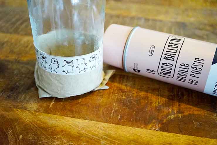 Pour la peinture, commencez par protéger la bouteille avec du papier et du scotch. Ensuite, bombez tout le haut de la bouteille avec la couleur choisie. Laissez sécher 45 minutes. Ajoutez une deuxième couche si nécessaire.
