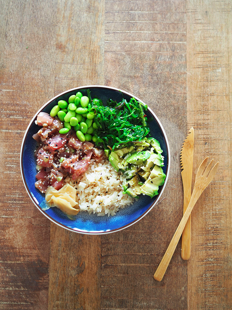 J’ai découvert ce plat d’origine Hawaïenne (pokaï) l’année dernière à Los Angeles. Des poké bowl il y en a partout. Des restaurants qui en proposent débarquent peu à peu à Paris et cette semaine j’ai eu envie de tester à la maison. L’idée est une base de riz, une marinade de thon cru et des condiments à gogo façon açaï bowl.