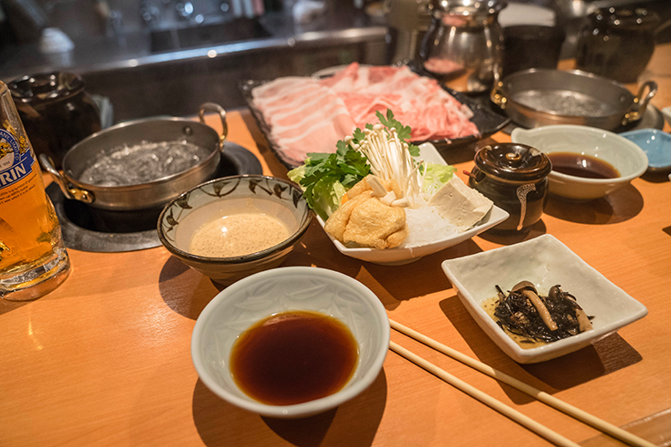 Il s’agissait d’une fondue. Différentes viandes découpées en très (très) fines tranches à faire cuire dans de l’eau bouillante. Mais aussi du tofu, des légumes, des nouilles… tout ça à faire ébouillanter donc et à assaisonner avec de la sauce soja, des épices et surtout leur célèbre sauce sésame sécrète.