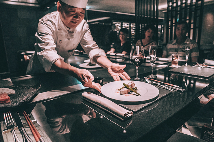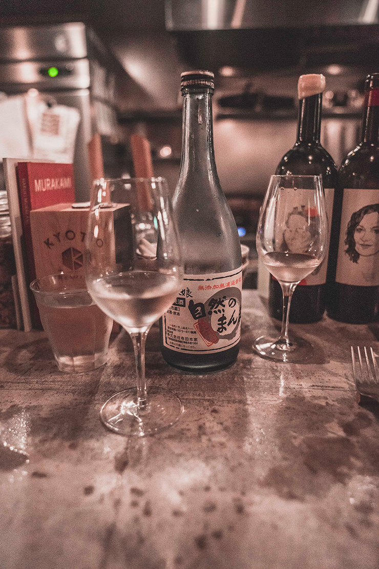 Nous étions assis au bar (j’avais croisé les doigts pour être face aux chefs) et c’est fascinés, attentifs, que nous avons découvert le dressage de nos plats les uns après les autres. Le soir, il s’agit d’un menu unique (10 000¥ avec les vins / personne ou 5800¥ / personne sans les vins) qui s’adapte aux allergies ou intolérances si jamais.