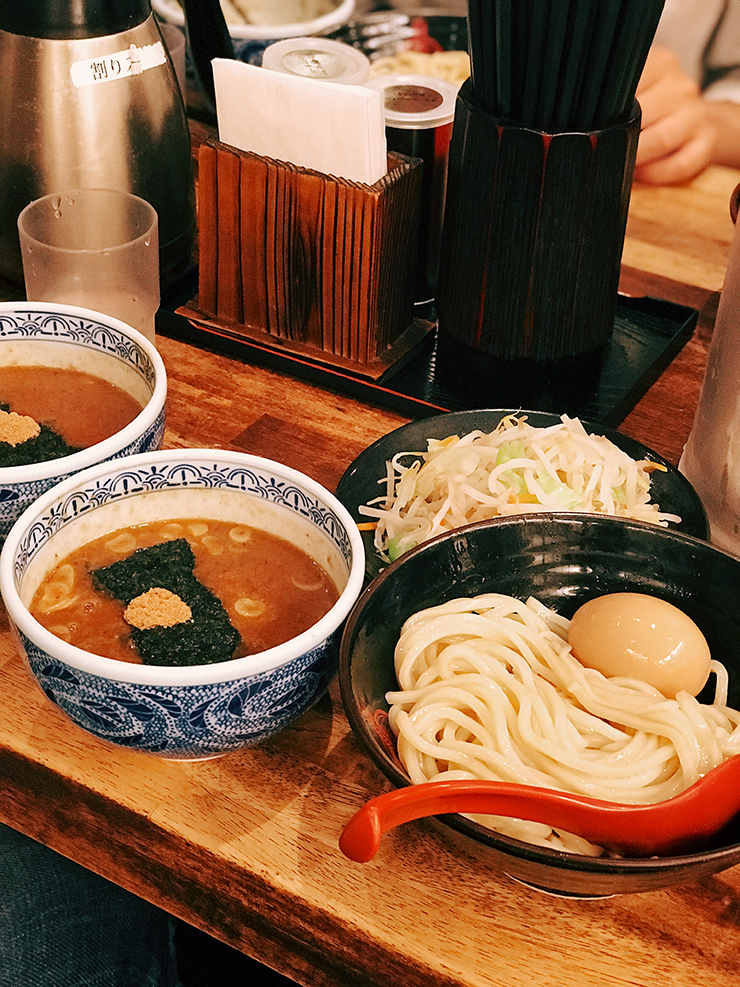 Une fois nos affaires déposées nous avons marché dans Shinjuku et nous avons déjeuné dans le quartier. Au hasard nous avons testé un ramen un peu spécial : des nouilles froides à tremper un bouillon/une sauce avec des légumes.