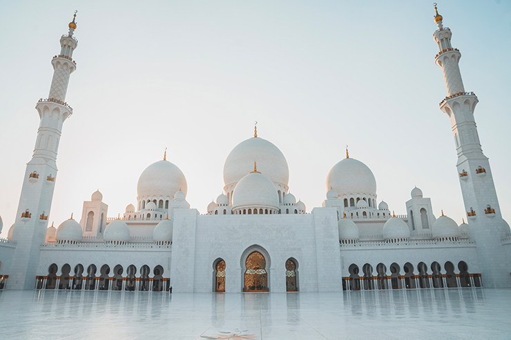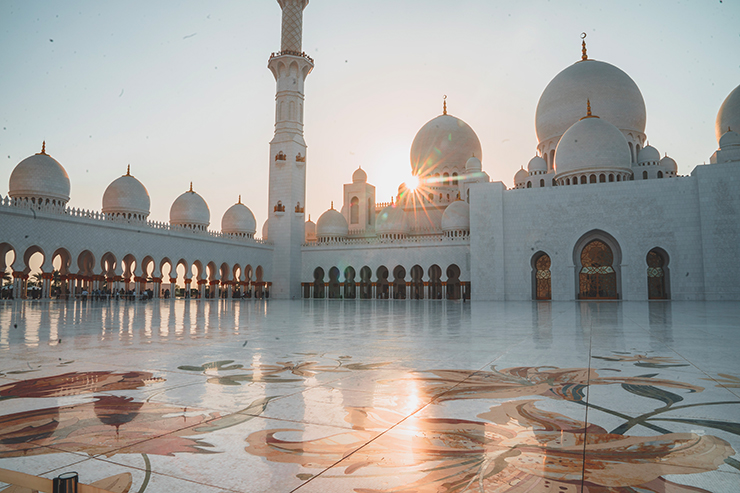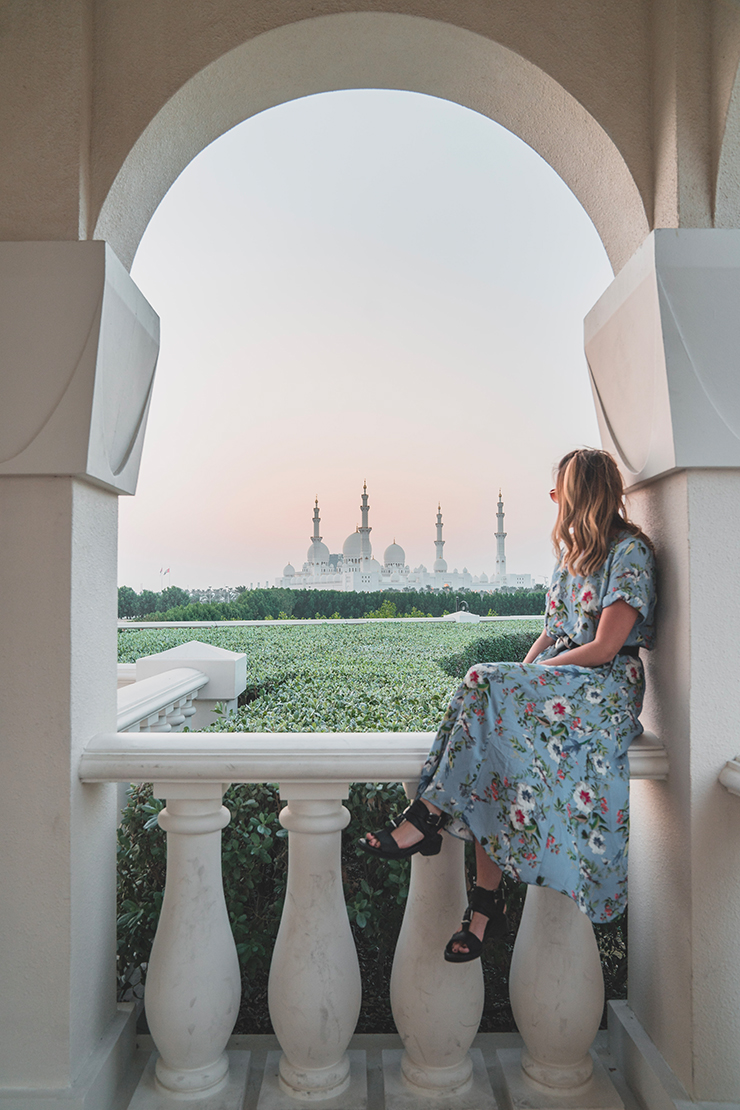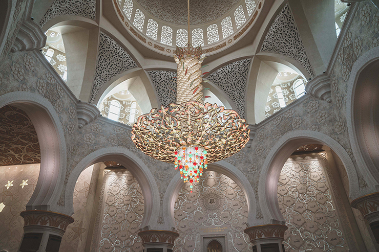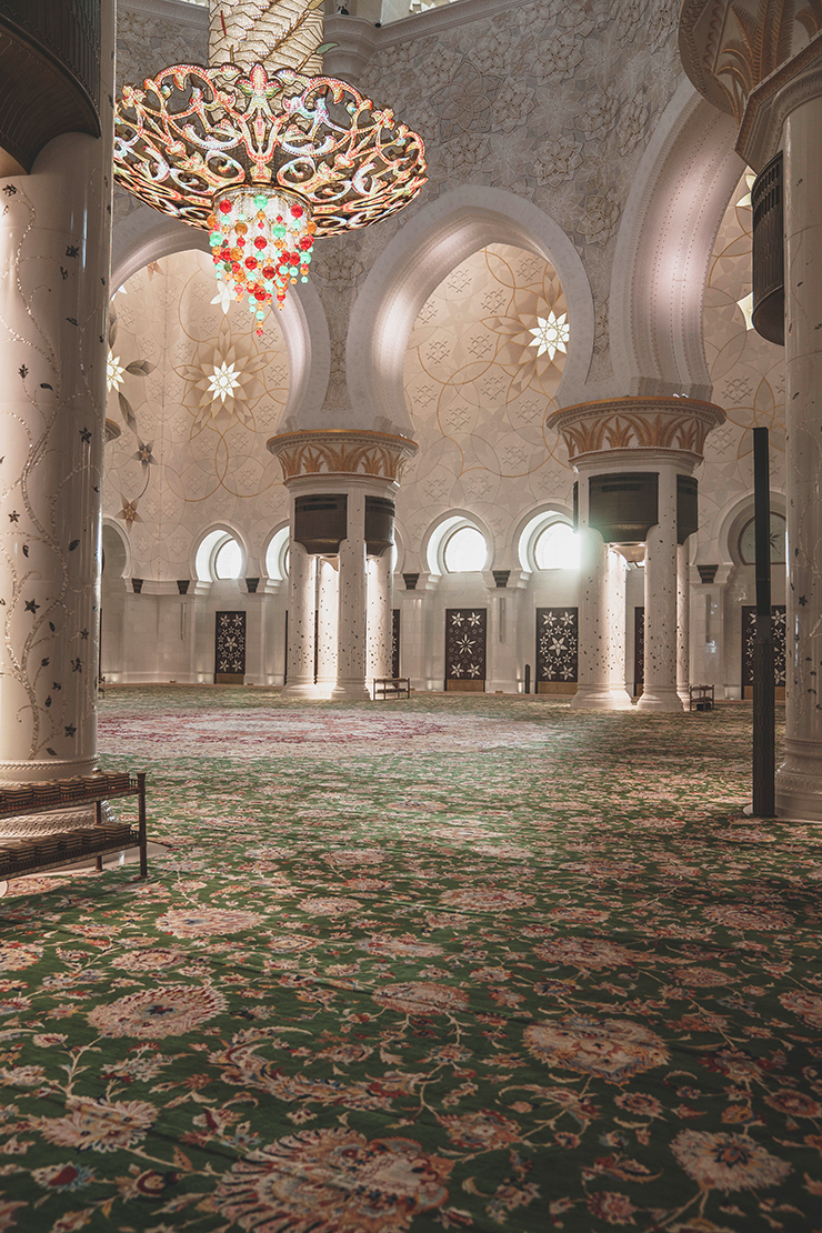 Vers 16h nous nous sommes rendus à la Grande Mosquée Cheikh Zayed. C’était l’heure idéale, juste avant le coucher du soleil. Une lumière magnifique nous a accompagnés tout au long de la visite (gratuite). L’extérieur est vraiment stupéfiant, la mosquée est majestueuse. L’intérieur est d’autant plus moderne, c’est étonnant. Nous avons ainsi marché sur le tapis le plus grand du monde.