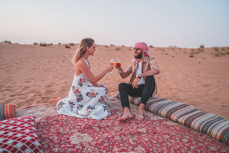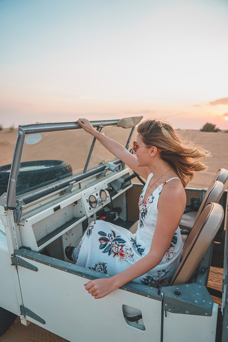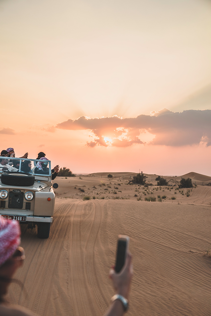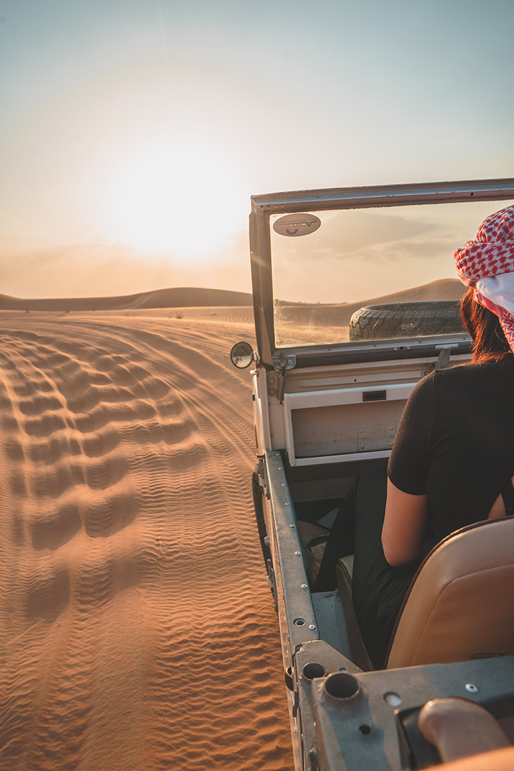 Direction le désert pour une balade en Land Rover, un petit stop les pieds dans le sable et un dîner spectacle dans un camp.