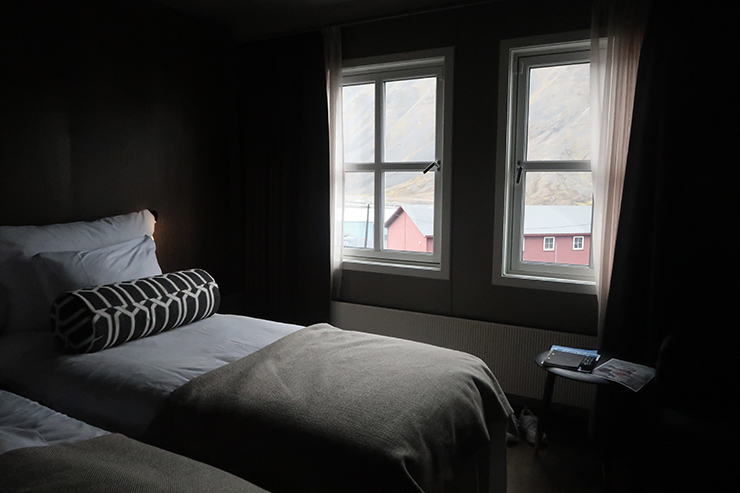 Après une première courte nuit (atterrissage à 2h du matin) nous nous sommes réveillés au Funken Lodge. Un hôtel très cosy de Longyearbyen (environ 200€ la nuit). Il faisait tout aussi jour qu’à notre coucher^^