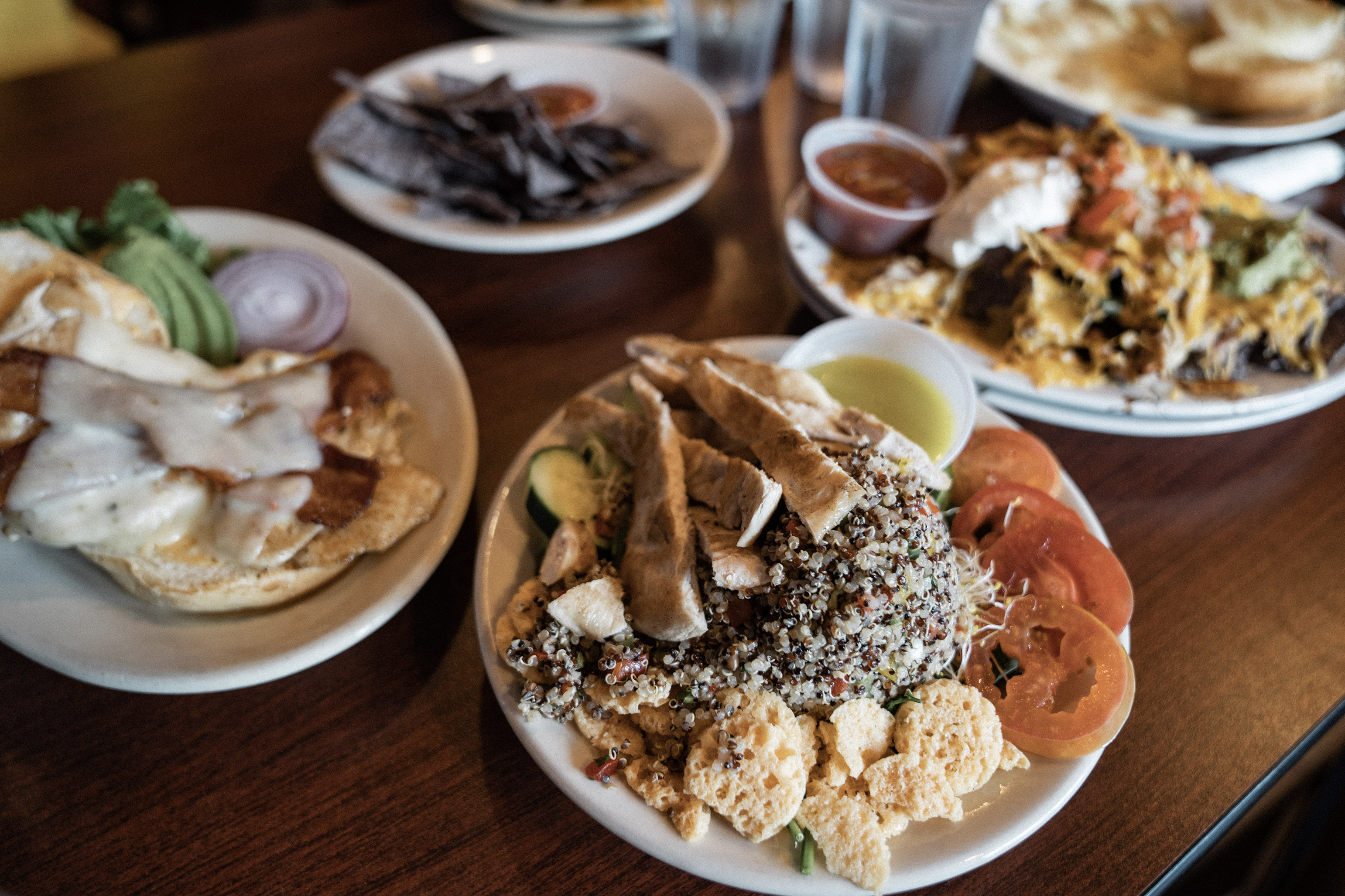 Déjeuner à Moab chez Peace Three. Salade de quinoa, burger, pasta, nachos… un déjeuner bien mérité après toutes ces sensations.