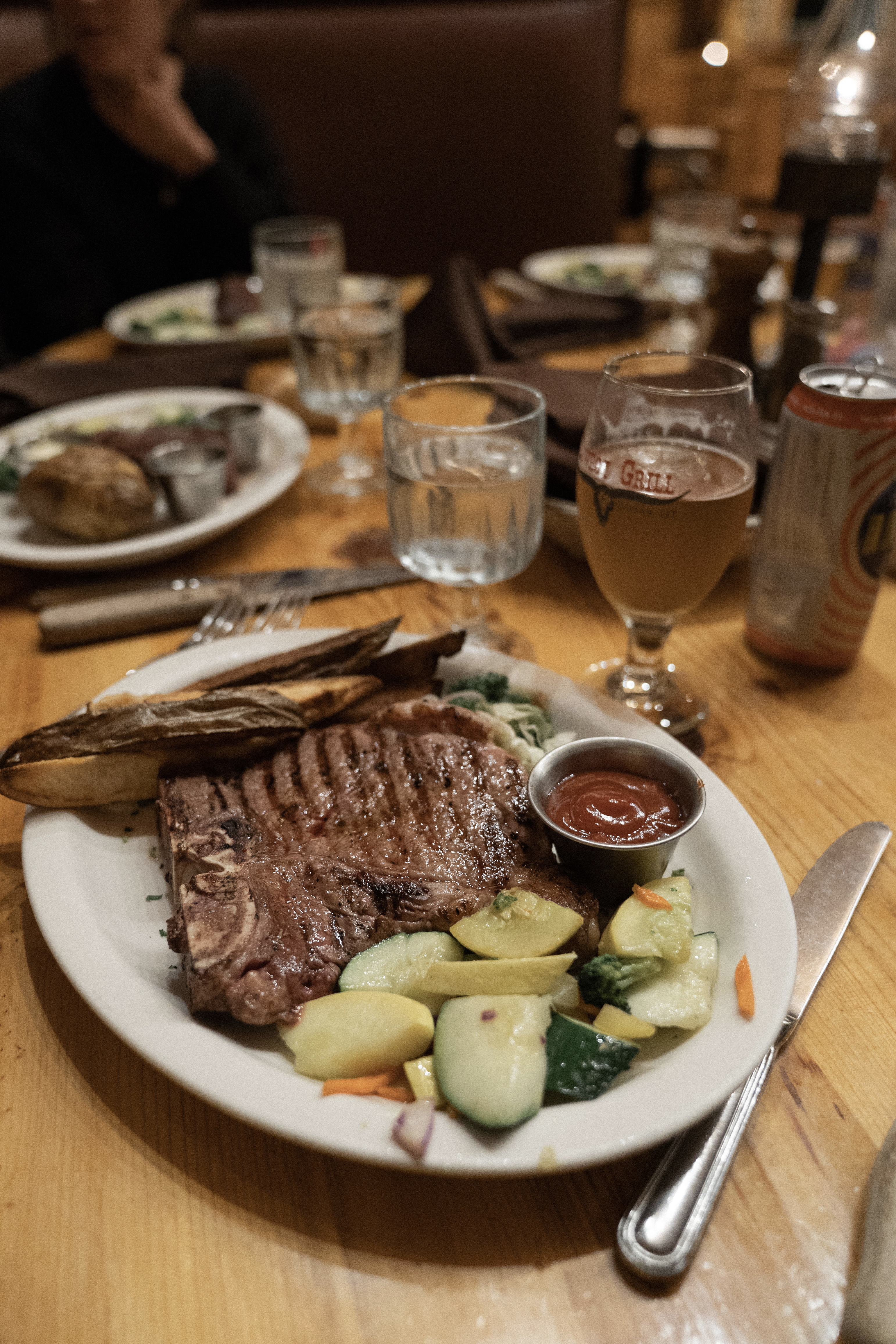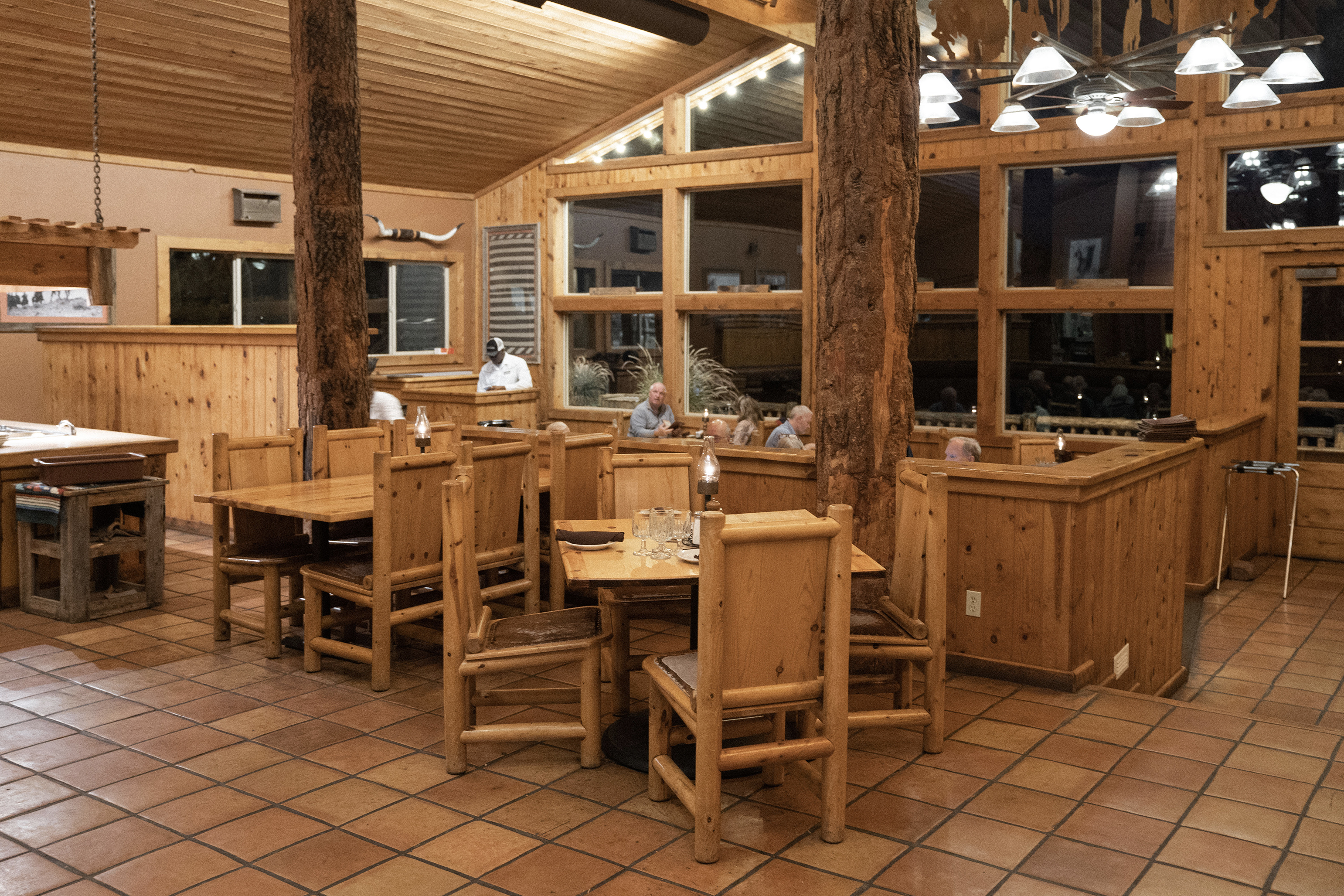 Dîner chez Cowboy Grill. Tout comme le restaurant du midi, cette adresse était proposée dans notre liste Évasions USA. Il s’agissait du restaurant d’un hôtel, à mi-chemin entre le centre ville de Moab et notre ranch. Un endroit très typique, tout en bois, avec vue sur le lac. Nous avons tous commandé un plat de viande grillée, super soirée.