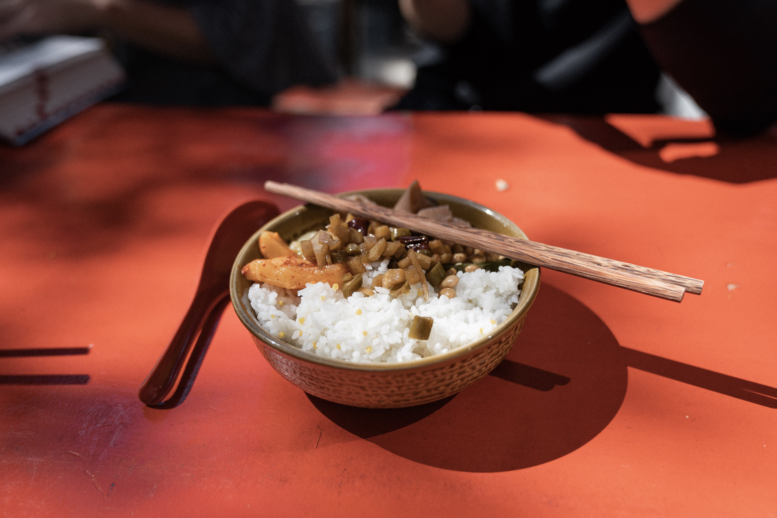 Yiran tang, buffet végétarien (0,60€/personne). Vous prenez un bol, vous vous servez du riz en base puis des légumes, haricots, pommes de terre, lotus, sauces… Vous pouvez vous resservir mais vous devez terminer votre plat !