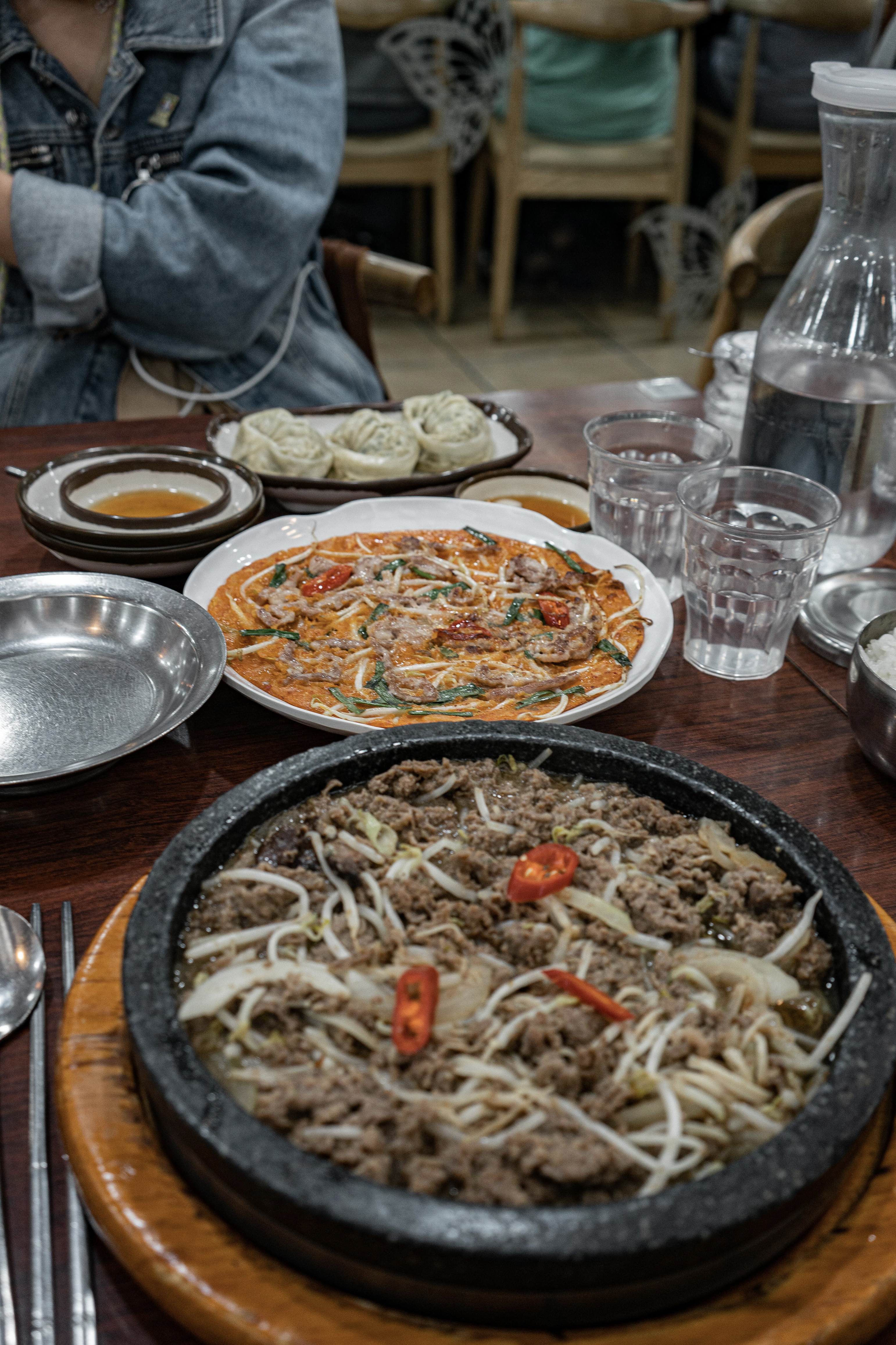 Dîner chez Sinseon Seolnongtang. Pancakes de kimchi, plat au bœuf, riz et dumplings.