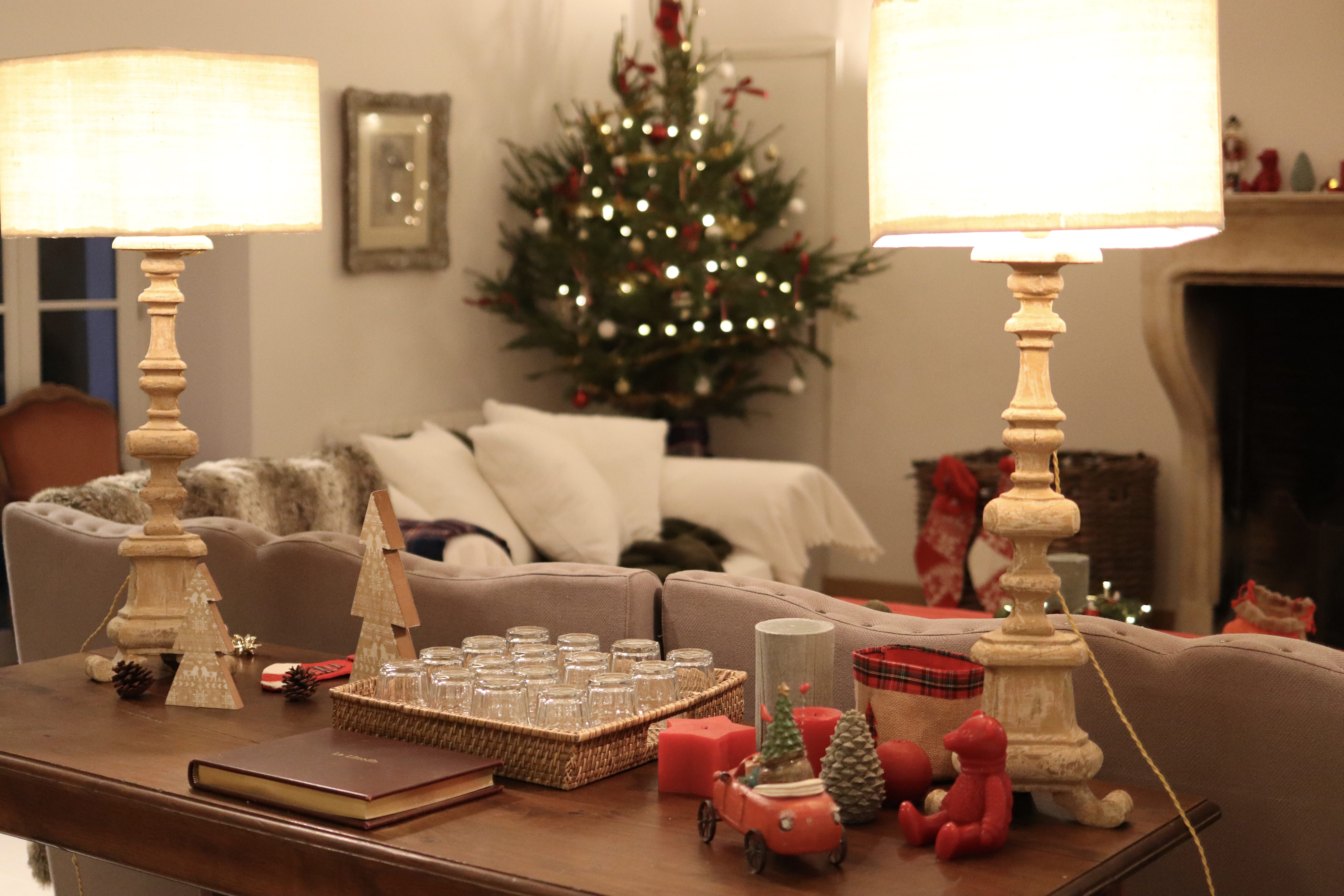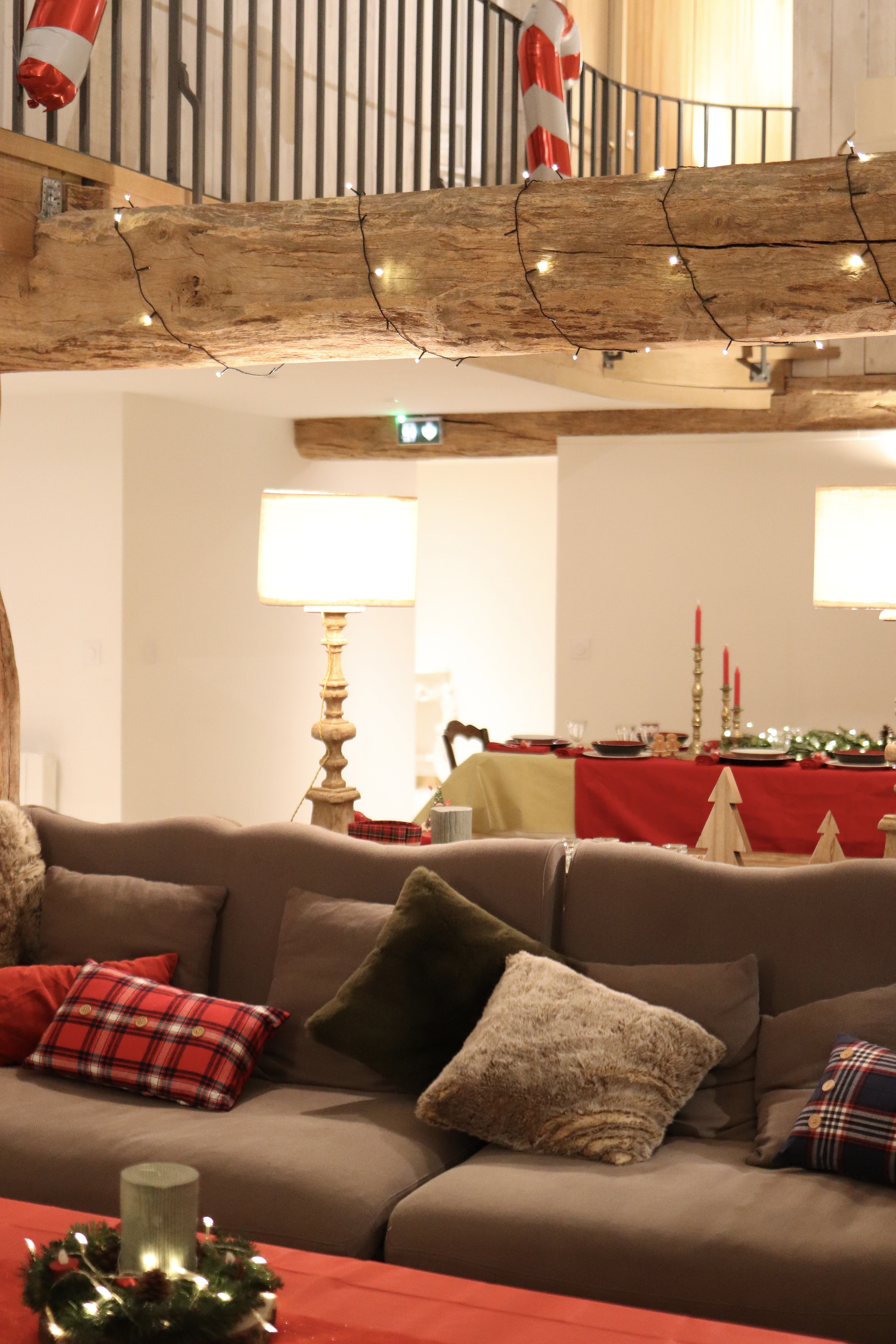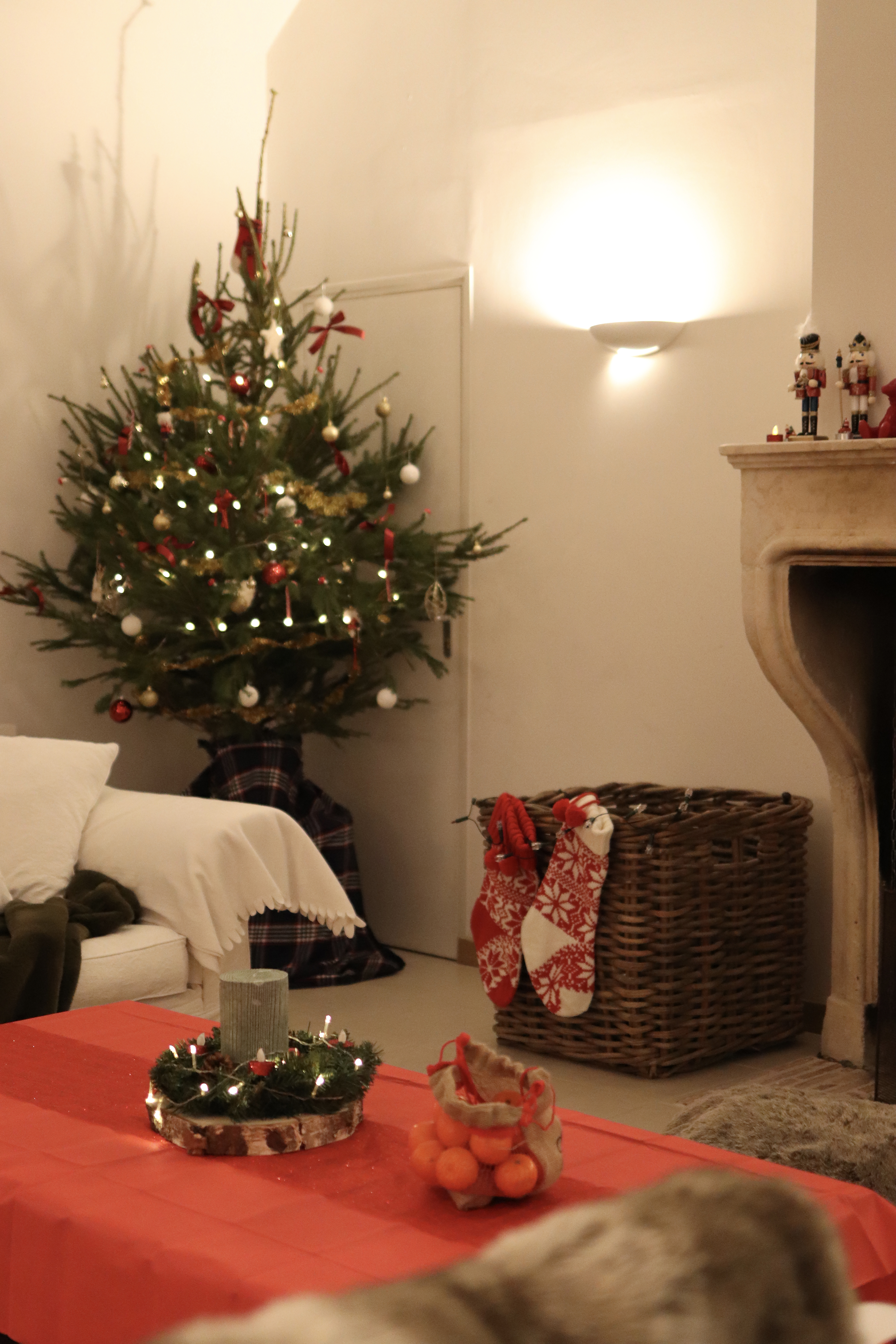 Je suis arrivée la veille avec Nico et une amie pour tout décorer. J’ai rangé dans un placard quelques déco, coussins… (en prenant des photos avant pour bien tout replacer ensuite) et j’ai décoré un sapin, ajouté des guirlandes lumineuses, des coussins, des plaides… je suis même venue avec ma vaisselle et quelques décorations pour ma table et la cheminée.