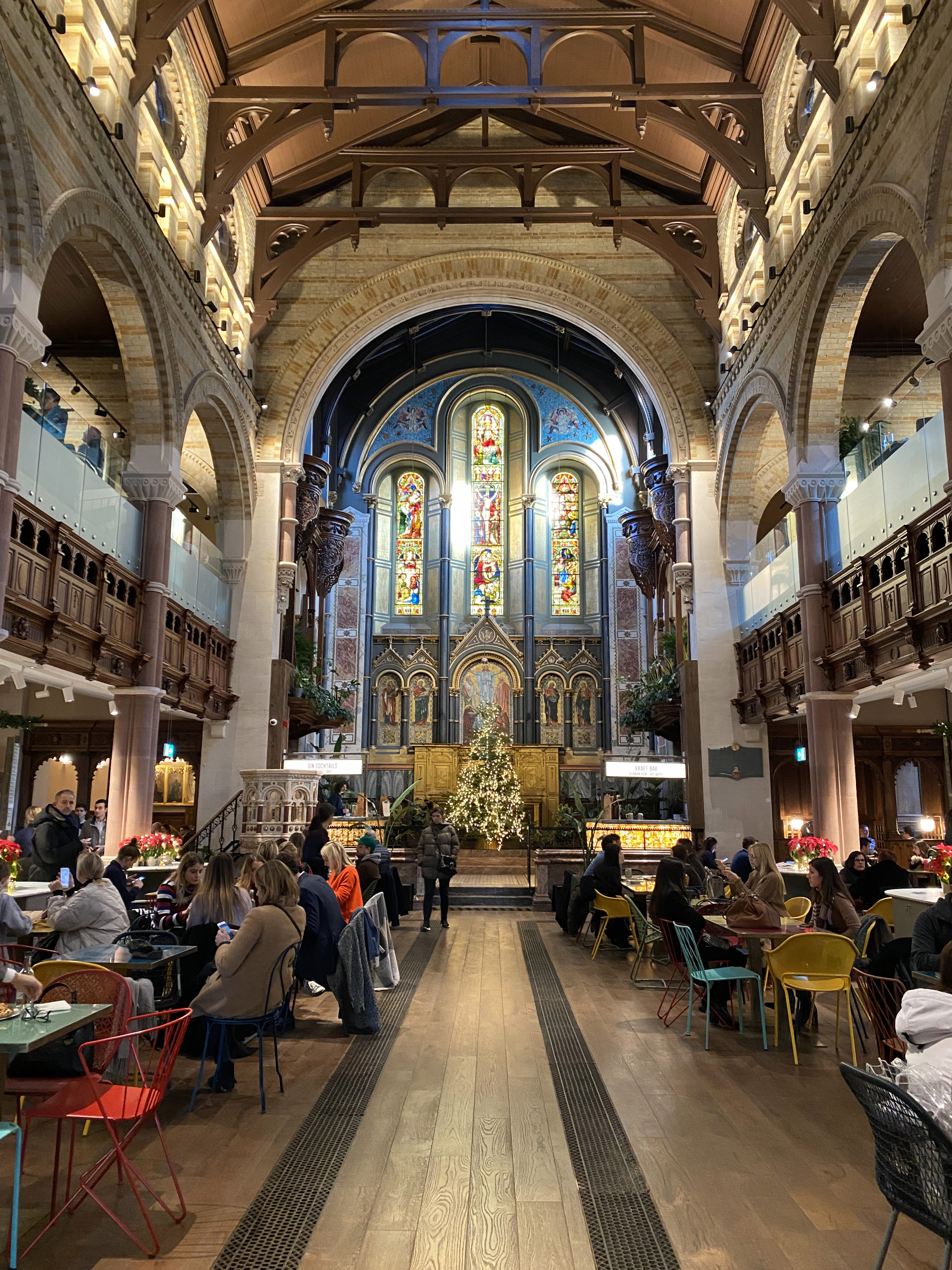 Le lieu est très très original ! Il n’est pas là seulement pour la période de Noël. Burgers, dumplings, huitres, glaces, pizzas, sushis, cocktails… Un food court installé dans une église.
