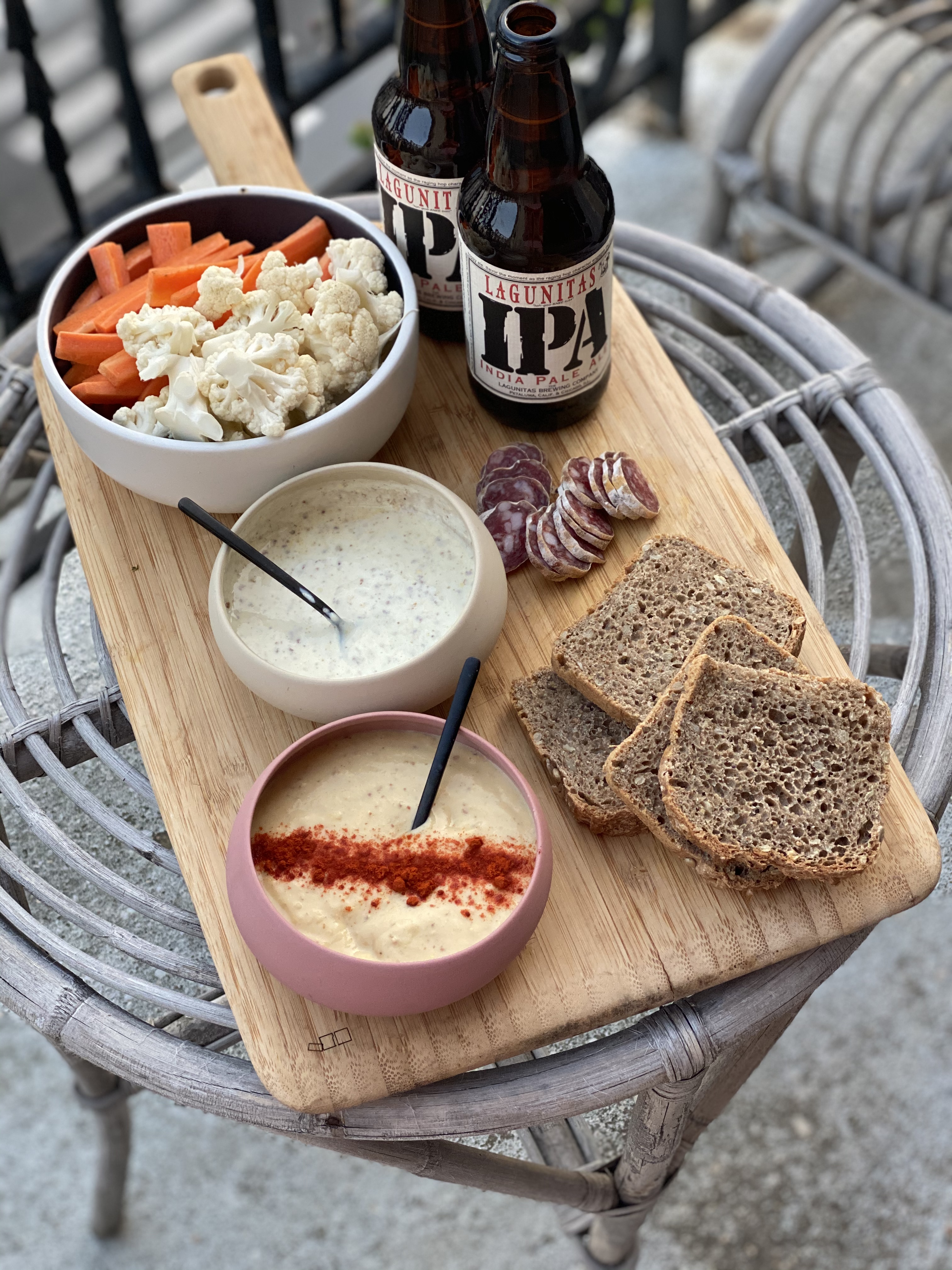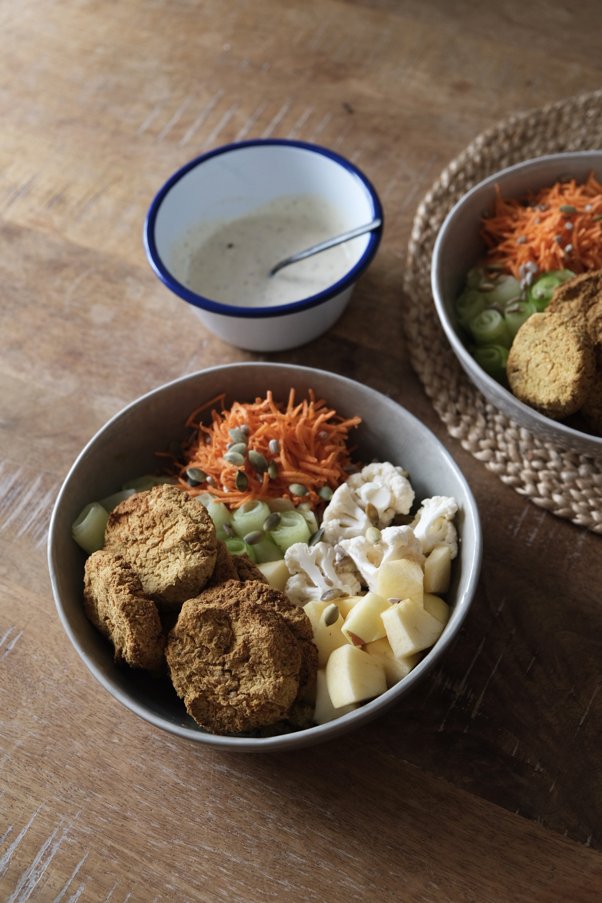 (ici chou fleur, carotte, houmous sans huile, sauce yaourt, pain complet maison)